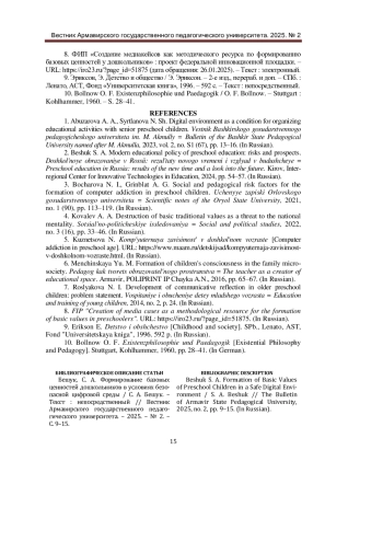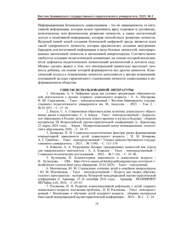 1. Абузарова, А. А. Цифровая среда как условие организации образовательной деятельности с детьми старшего дошкольного возраста / А. А. Абузарова, Н. Ш. Сыртланова. - Текст: непосредственный // Вестник Башкирского государственного педагогического университета им. М. Акмуллы. - 2023. - Том 2. - № S1 (67). - С. 13-16. EDN: ZAPRRU