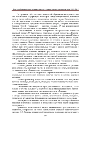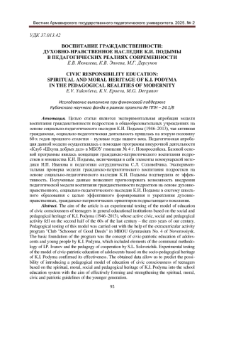 Целью статьи является экспериментальная апробация модели воспитания гражданственности подростков в общеобразовательных учреждениях на основе социально-педагогического наследия К. И. Подымы (1946-2013), чья активная гражданская, социально-педагогическая деятельность пришлась на вторую половину 60-х годов прошлого столетия - нулевые годы нашего века. Педагогическая апробация данной модели осуществлялась с помощью программы внеурочной деятельности «Клуб «Шхуна добрых дел» в МБОУ гимназии № 4 г. Новороссийска. Базовой основой программы явилась концепция гражданско-патриотического воспитания подростков и юношества К. И. Подымы, включающая в себя элементы коммунарской методики И. П. Иванова и педагогики сотрудничества С. Л. Соловейчика. Экспериментальная проверка модели гражданско-патриотического воспитания подростков на основе социально-педагогического наследия К. И. Подымы подтвердила ее эффективность. Полученные данные позволяют прогнозировать возможность внедрения педагогической модели воспитания гражданственности подростков на основе духовно-нравственного, социально-педагогического наследия К. И. Подымы в систему школьного образования с целью эффективного формирования и укрепления духовно-нравственных, гражданско-патриотических ориентиров подрастающего поколения.