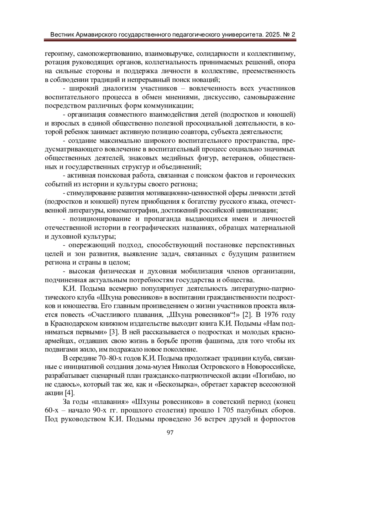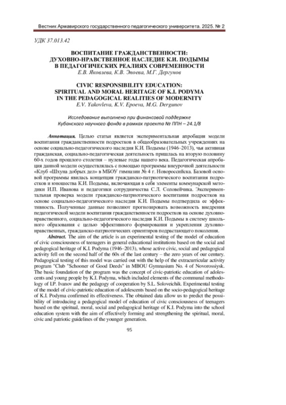 Статья посвящена анализу состояния гражданско-патриотического воспитания молодежи в контексте современных социально-педагогических вызовов. Актуальность статьи определяется наличием серьезных противоречий в гражданско-патриотическом воспитании молодежи, обусловленных доминированием в настоящее время инструментально-технологической основы российского образования над его идеальной, духовно-нравственной сферой. В качестве предмета исследования анализируется продолжение идей педагогики общей заботы И. П. Иванова, педагогики сотрудничества С. Л. Соловейчика в социально-педагогическом наследии К. И. Подымы и разработка на этой основе собственной авторской (К. И. Подымы) концепции гражданско-патриотического воспитания подростков и юношества. Данная концепция с успехом применялась К. И. Подымой в 60-90-е годы прошлого столетия в деятельности созданного им в Новороссийске литературно-патриотического клуба для подростков и юношей «Шхуна ровесников». Авторы рассматривают педагогическое наследие К. И. Подымы в аспекте преемственности для современной социально-педагогической практики воспитания гражданственности и патриотизма у подрастающих поколений, актуальное в контексте идей суверенизации страны и опоры на ценностные основания российской культуры.