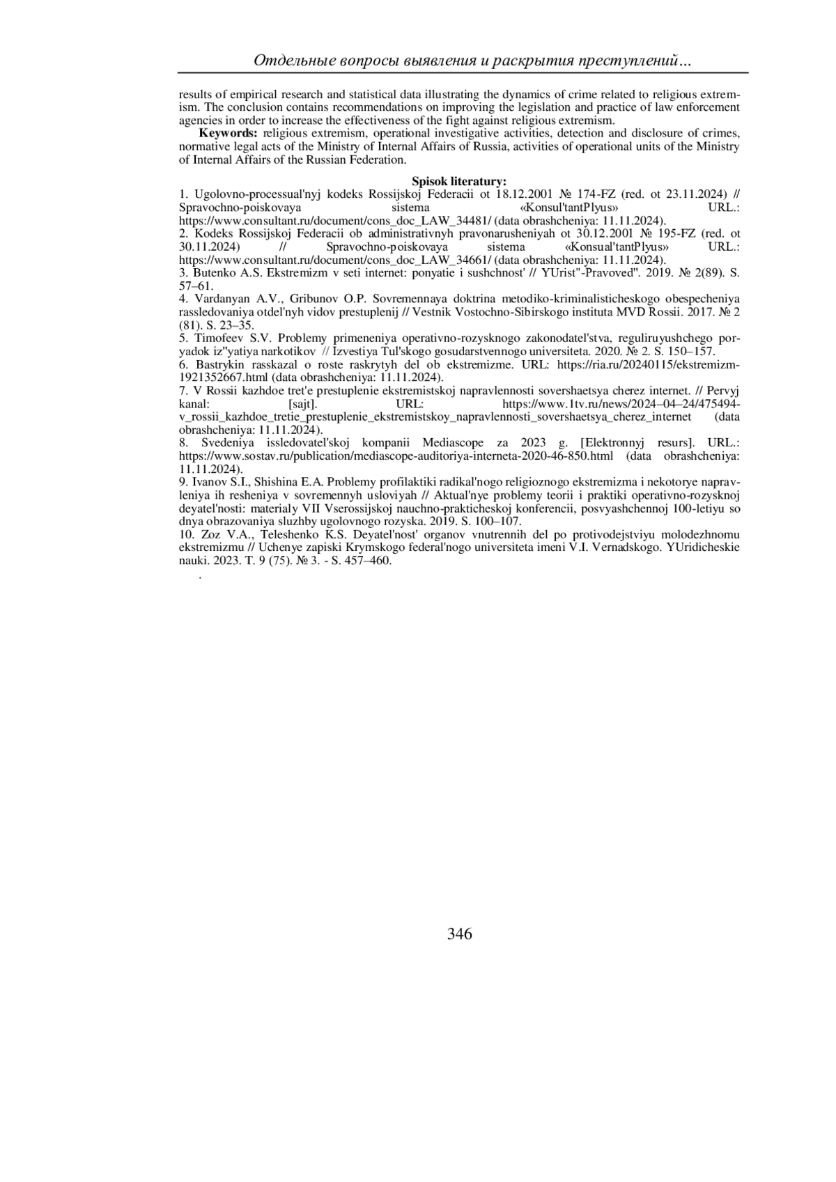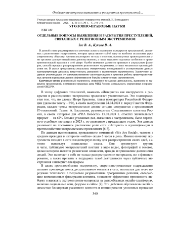 Статья: ОТДЕЛЬНЫЕ ВОПРОСЫ ВЫЯВЛЕНИЯ И РАСКРЫТИЯ ПРЕСТУПЛЕНИЙ, СВЯЗАННЫХ С РЕЛИГИОЗНЫМ ЭКСТРЕМИЗМОМ (2025)