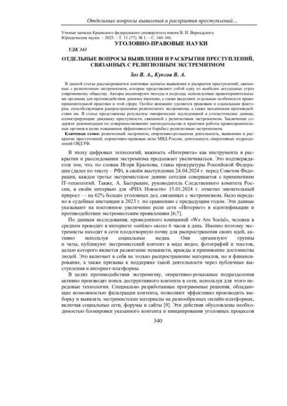 ЗОЗ В. А., КУКСОВ В. А. ОТДЕЛЬНЫЕ ВОПРОСЫ ВЫЯВЛЕНИЯ И РАСКРЫТИЯ ПРЕСТУПЛЕНИЙ, СВЯЗАННЫХ С РЕЛИГИОЗНЫМ ЭКСТРЕМИЗМОМ // УЧЕНЫЕ ЗАПИСКИ КРЫМСКОГО ФЕДЕРАЛЬНОГО УНИВЕРСИТЕТА ИМЕНИ В. И. ВЕРНАДСКОГО. ЮРИДИЧЕСКИЕ НАУКИ. 2025. ТОМ 11(77). №1