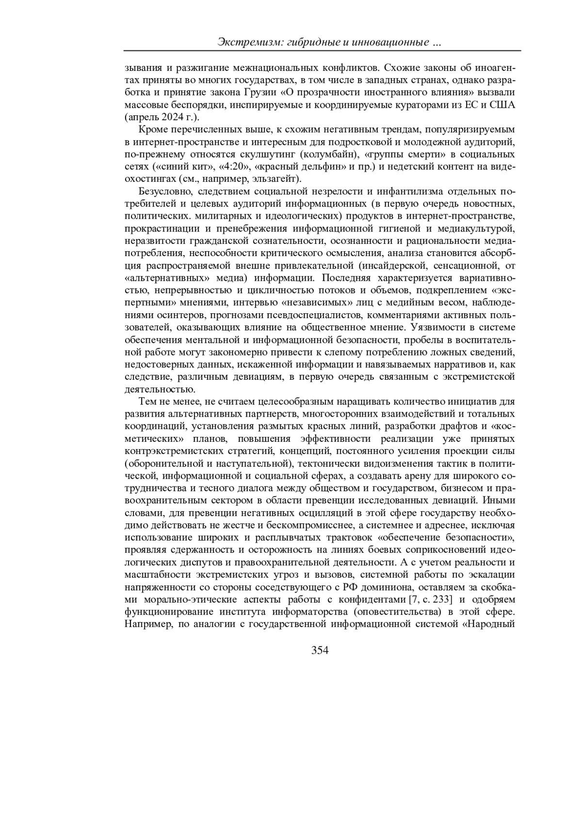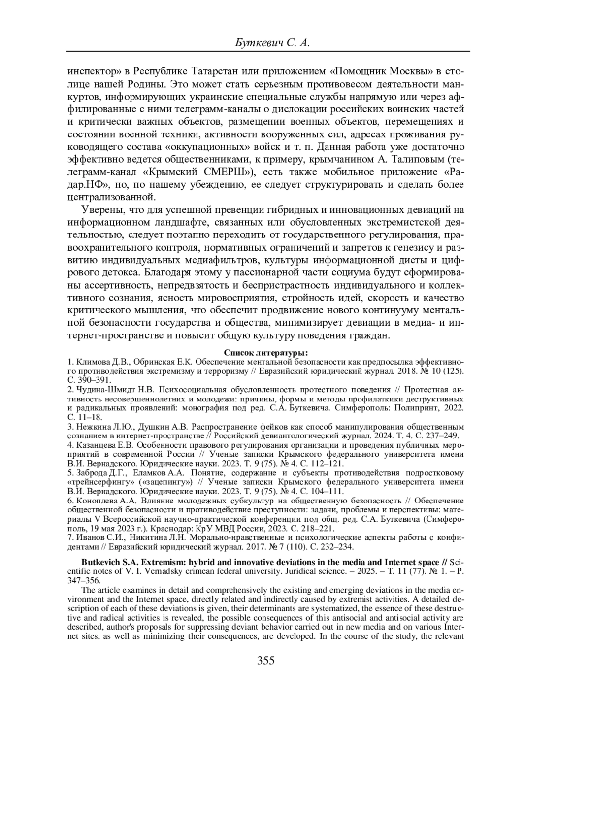 1. Климова Д.В., Обринская Е.К. Обеспечение ментальной безопасности как предпосылка эффективного противодействия экстремизму и терроризму // Евразийский юридический журнал. 2018. № 10 (125). С. 390-391. EDN: AIKYYJ