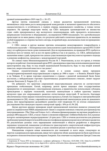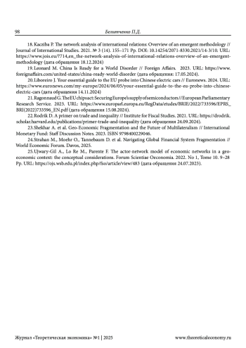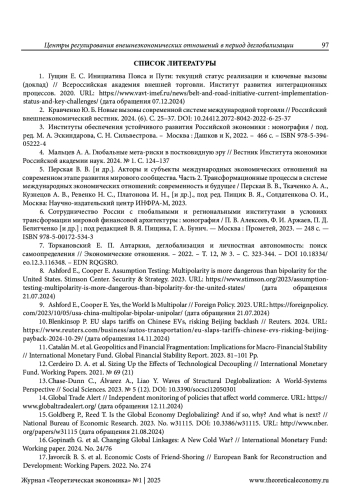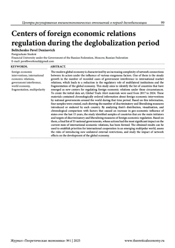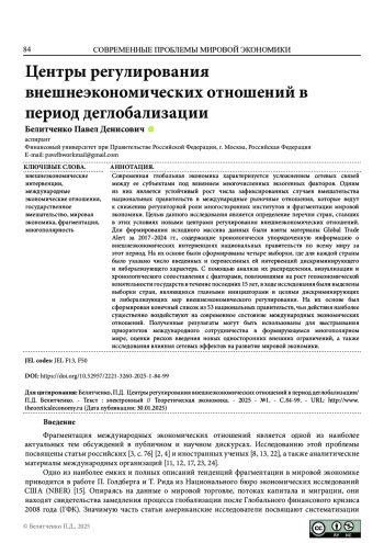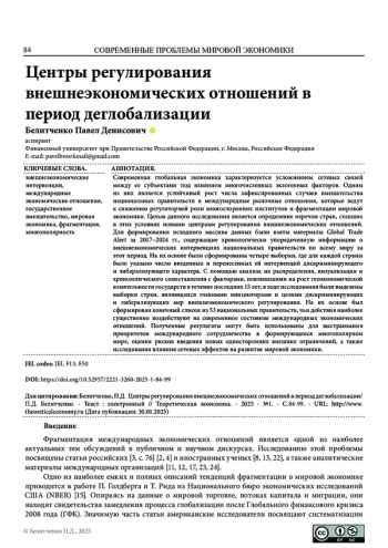 БЕЛИТЧЕНКО П. Д. ЦЕНТРЫ РЕГУЛИРОВАНИЯ ВНЕШНЕЭКОНОМИЧЕСКИХ ОТНОШЕНИЙ В ПЕРИОД ДЕГЛОБАЛИЗАЦИИ // ТЕОРЕТИЧЕСКАЯ ЭКОНОМИКА. 2025. № 1 (121)