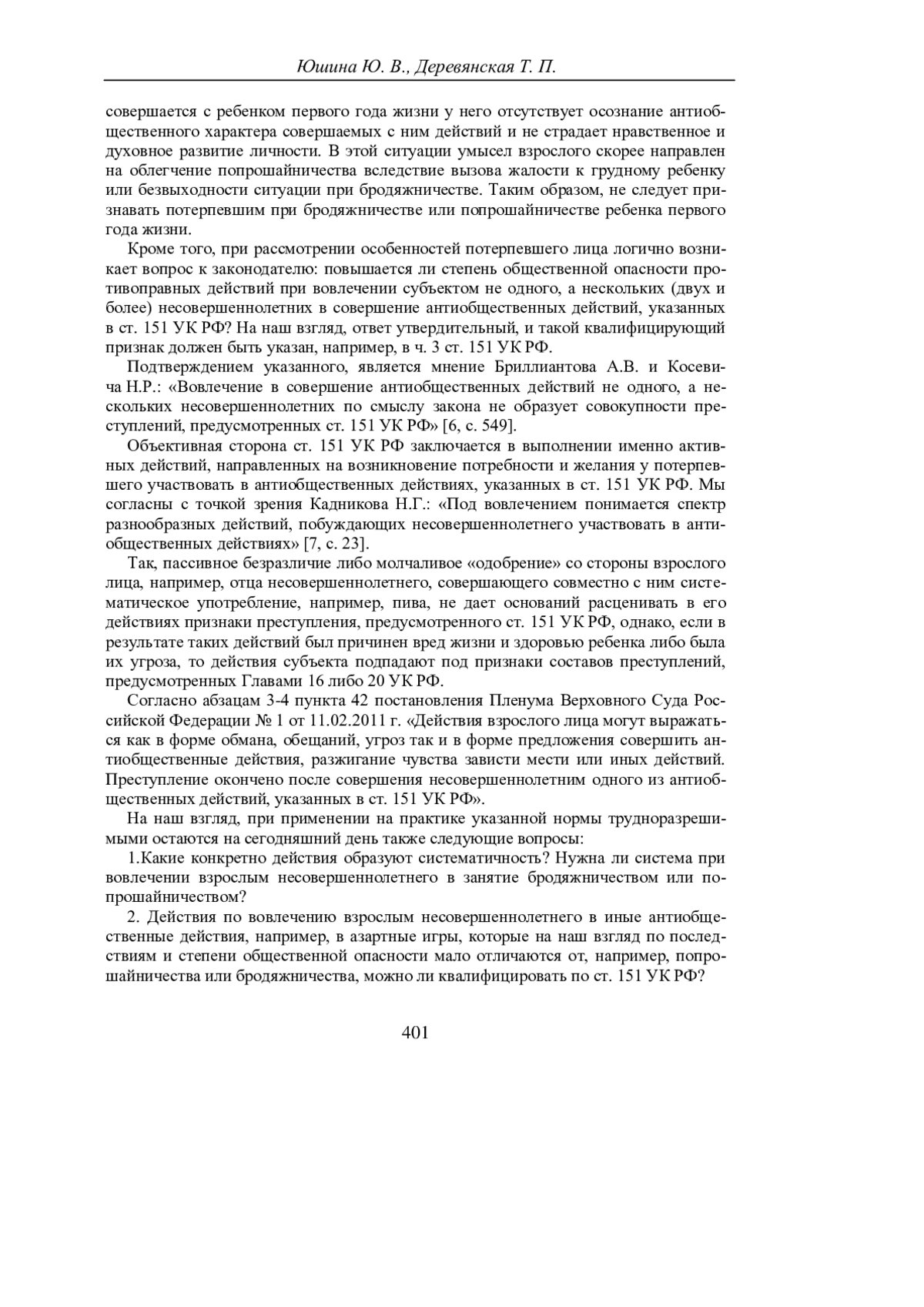 4. Кладков А., Суспицина Т. Вовлечение несовершеннолетнего в совершение преступления и иных антиобщественных действий (ст.ст. 150, 151 УК РФ) // Уголовное право. - 2002. - № 3. - С. 22-26.
