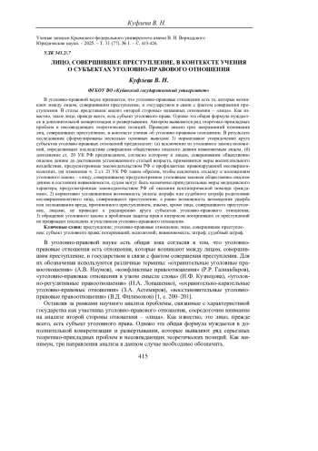 В уголовно-правовой науке признается, что уголовно-правовые отношения есть те, которые возникают между лицом, совершившим преступление, и государством в связи с фактом совершения преступления. В статье представлен анализ «второй стороны» названных отношения - «лица». Как известно, такое лицо, прежде всего, есть субъект уголовного права. Однако эта общая формула нуждается в дополнительной конкретизации и развертывании. Автором выявляется ряд теоретико-прикладных проблем и несовпадающих теоретических позиций. Проведен анализ трех направлений понимания лиц, совершивших преступление, в контексте учения об уголовно-правовом отношении. В результате исследования сформулированы несколько основных выводов: 1) нормативное упорядочение круга субъектов уголовно-правовых отношений предполагает: (а) исключение из уголовного закона положений, определяющих последствия совершения общественно опасного деяния невменяемым лицом, (б) дополнение ст. 20 УК РФ предписанием, согласно которому к лицам, совершившим общественно опасное деяние до достижения установленного статьей возраста, применяются меры воспитательного воздействия, предусмотренные законодательством РФ о профилактике правонарушений несовершеннолетних, (в) изменение ч. 2 ст. 21 УК РФ таким образом, чтобы исключить отсылку к положениям уголовного закона - «лицу, совершившему предусмотренное уголовным законом общественно опасное деяние в состоянии невменяемости, судом могут быть назначены принудительные меры медицинского характера, предусмотренные законодательством РФ об оказании психиатрической помощи гражданам»; 2) нормативно установленная возможность уплаты штрафа или судебного штрафа родителями несовершеннолетнего лица, совершившего преступление, а равно возможность возмещения ущерба или заглаживания вреда, причиненного преступлением, иными, кроме лица, совершившего преступление, лицами, не приводит к расширению круга субъектов уголовно-правового отношения; 3) обращение уголовного закона к проблемам защиты прав и интересов потерпевших от преступлений не превращает последних в участников уголовно-правового отношения.