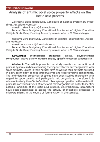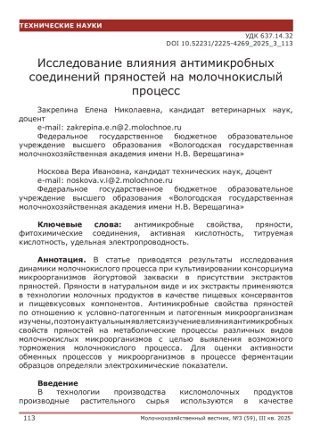 В статье приводятся результаты исследования динамики молочнокислого процесса при культивировании консорциума микроорганизмов йогуртовой закваски в присутствии экстрактов пряностей. Пряности в натуральном виде и их экстракты применяются в технологии молочных продуктов в качестве пищевых консервантов и пищевкусовых компонентов. Антимикробные свойства пряностей по отношению к условно-патогенным и патогенным микроорганизмам изучены, поэтому актуальным является изучение влияния антимикробных свойств пряностей на метаболические процессы различных видов молочнокислых микроорганизмов с целью выявления возможного торможения молочнокислого процесса. Для оценки активности обменных процессов у микроорганизмов в процессе ферментации образцов определяли электрохимические показатели.