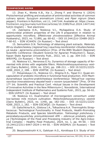 22. Биохимическая активность микробных ассоциатов при совместном культивировании / Е.Н. Закрепина, В.И. Носкова, И.С. Полянская, О.А. Муллагалиева // Инновационные технологии и технические средства для АПК: материалы международной научно-практической конференции молодых ученых и специалистов, посвященной 110-летию ФГБОУ ВО “Воронежский государственный аграрный университет имени императора Петра I”. - Воронеж: Воронежский государственный аграрный университет им. Императора Петра I, 2022. - С. 493-497.
