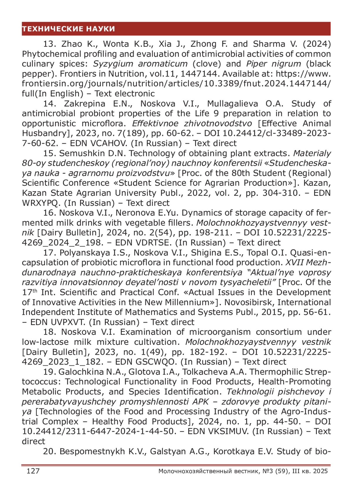18. Носкова, В.И. Исследование консорциума микроорганизмов при культивировании в низколактозных молочных смесях / В.И. Носкова // Молочнохозяйственный вестник. - 2023. - № 1(49). - С. 182-192. -. DOI: 10.52231/2225-4269_2023_1_182