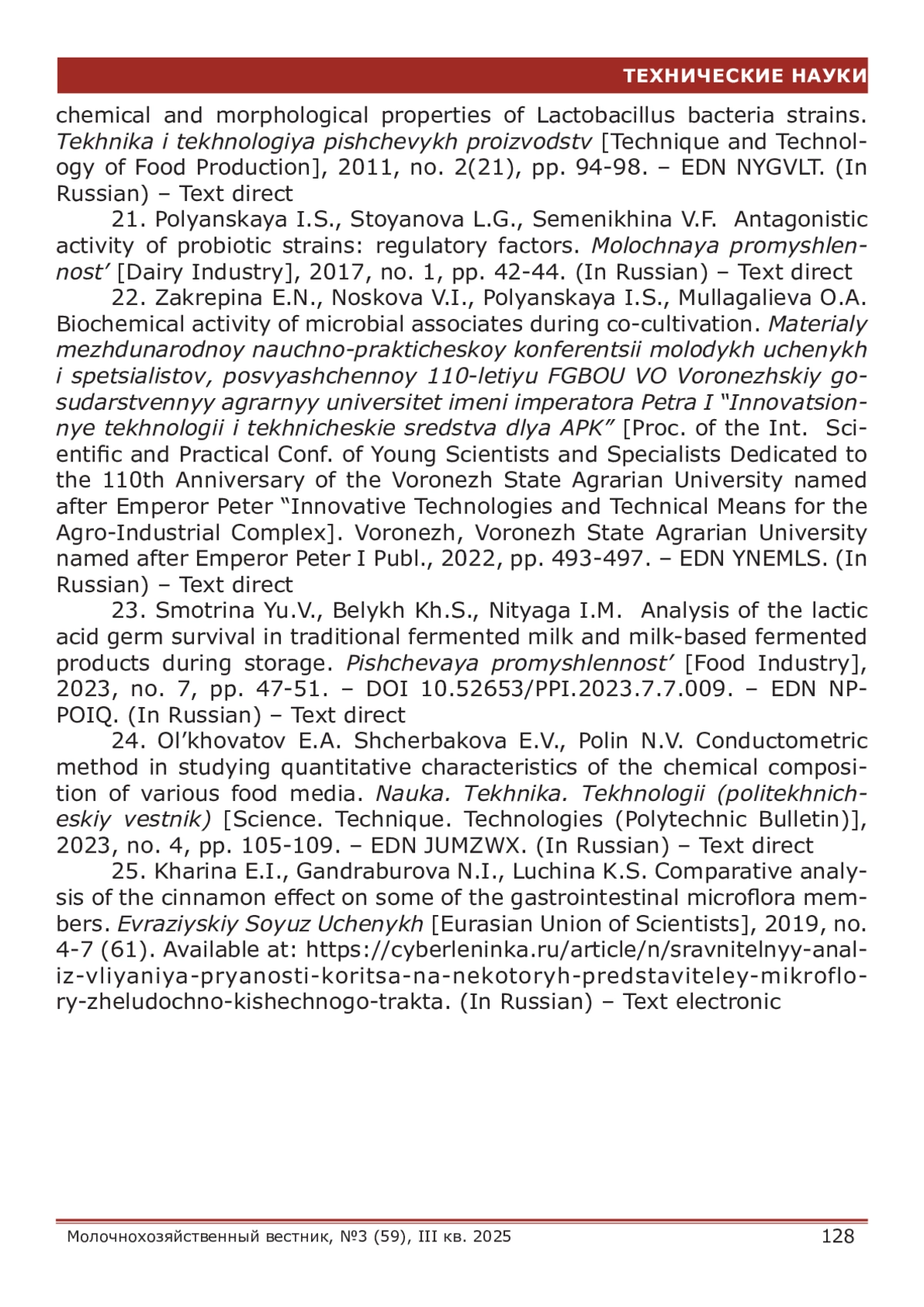 21. Полянская, И.С. Антагонистическая активность пробиотических штаммов: факторы регулирования / И.С. Полянская, Л.Г. Стоянова, В.Ф. Семенихина // Молочная промышленность. - 2017. - № 1. - С. 42-44.