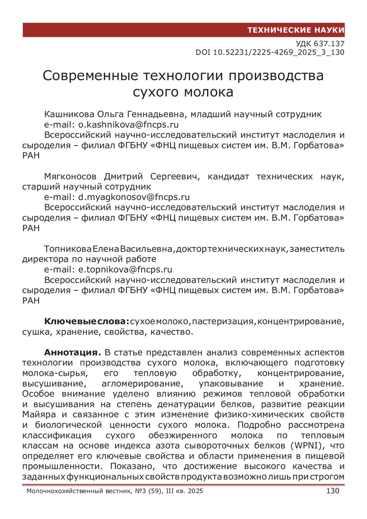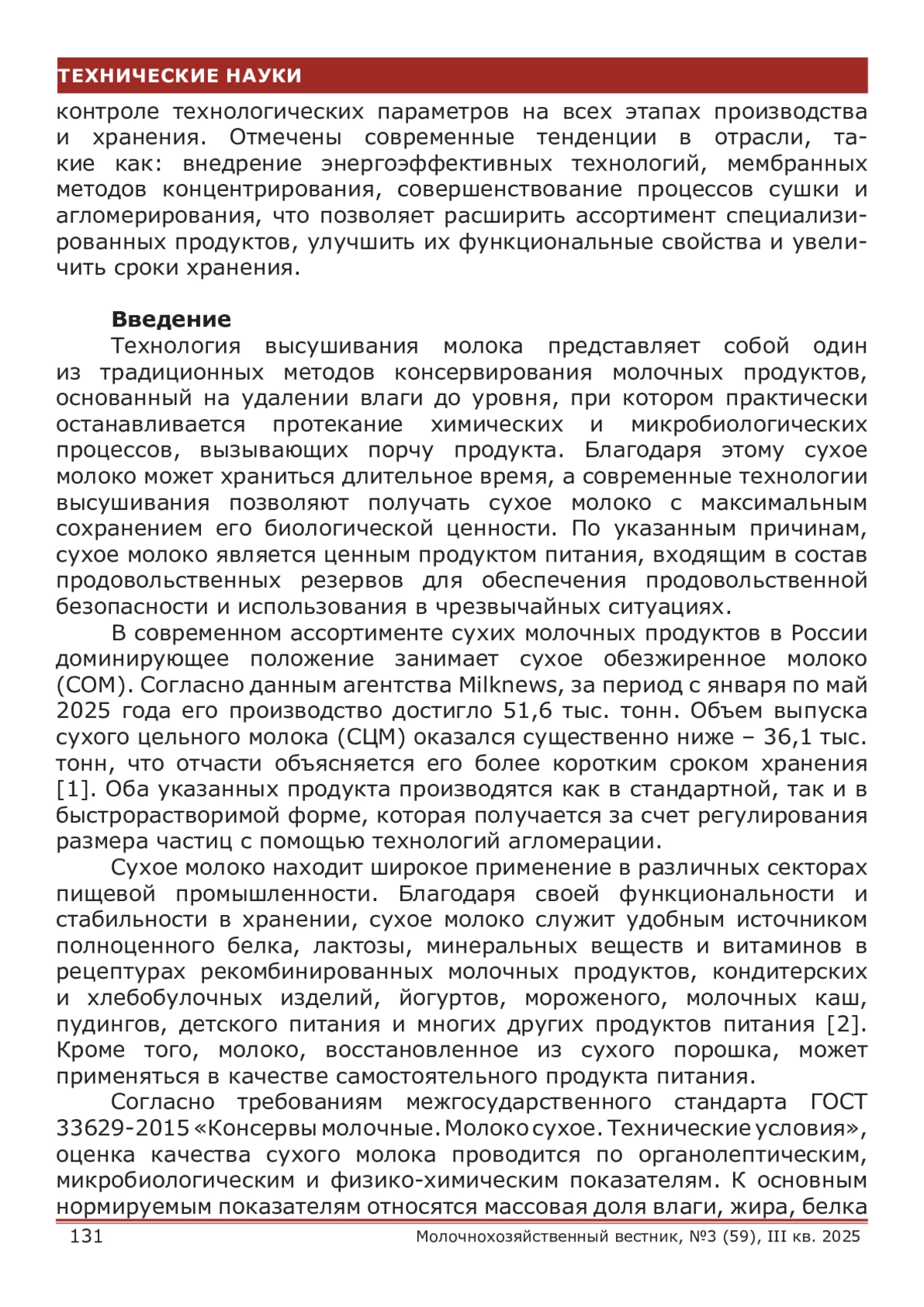 В статье представлен анализ современных аспектов технологии производства сухого молока, включающего подготовку молока-сырья, его тепловую обработку, концентрирование, высушивание, агломерирование, упаковывание и хранение. Особое внимание уделено влиянию режимов тепловой обработки и высушивания на степень денатурации белков, развитие реакции Майяра и связанное с этим изменение физико-химических свойств и биологической ценности сухого молока. Подробно рассмотрена классификация сухого обезжиренного молока по тепловым классам на основе индекса азота сывороточных белков (WPNI), что определяет его ключевые свойства и области применения в пищевой промышленности. Показано, что достижение высокого качества и заданных функциональных свойств продукта возможно лишь при строгом контроле технологических параметров на всех этапах производства и хранения. Отмечены современные тенденции в отрасли, такие как: внедрение энергоэффективных технологий, мембранных методов концентрирования, совершенствование процессов сушки и агломерирования, что позволяет расширить ассортимент специализированных продуктов, улучшить их функциональные свойства и увеличить сроки хранения.