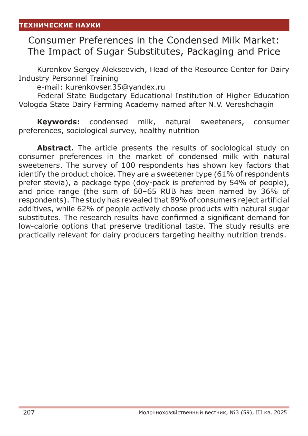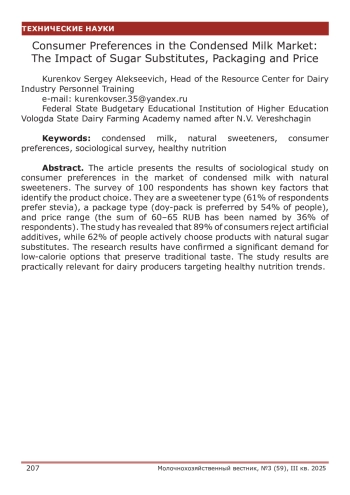 КУРЕНКОВ С. А. ПОТРЕБИТЕЛЬСКИЕ ПРЕДПОЧТЕНИЯ НА РЫНКЕ СГУЩЕННОГО МОЛОКА: ВЛИЯНИЕ САХАРОЗАМЕНИТЕЛЕЙ, УПАКОВКИ И ЦЕНЫ // МОЛОЧНОХОЗЯЙСТВЕННЫЙ ВЕСТНИК. 2025. № 3 (59)