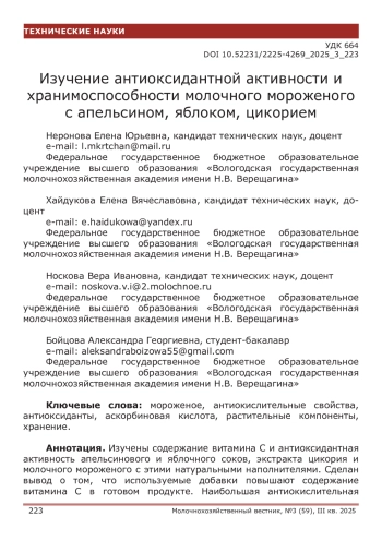 Изучены содержание витамина С и антиоксидантная активность апельсинового и яблочного соков, экстракта цикория и молочного мороженого с этими натуральными наполнителями. Сделан вывод о том, что используемые добавки повышают содержание витамина С в готовом продукте. Наибольшая антиокислительная активность (4,167 мг/г) характерна для цикория. Далее по убыванию следуют яблочное пюре и апельсиновый сок. Наибольшее количество витамина С содержится в апельсиновом соке (28,7 мг/100 г), наименьшее – в жидком экстракте цикория (0,2 мг/100 г). За счет высокой антиоксидантной активности, обусловленной использованием апельсинового и яблочного соков, экстракта цикория, молочное мороженое имеет лучшую хранимоспособность по сравнению с продуктом, производимом без этих наполнителей.