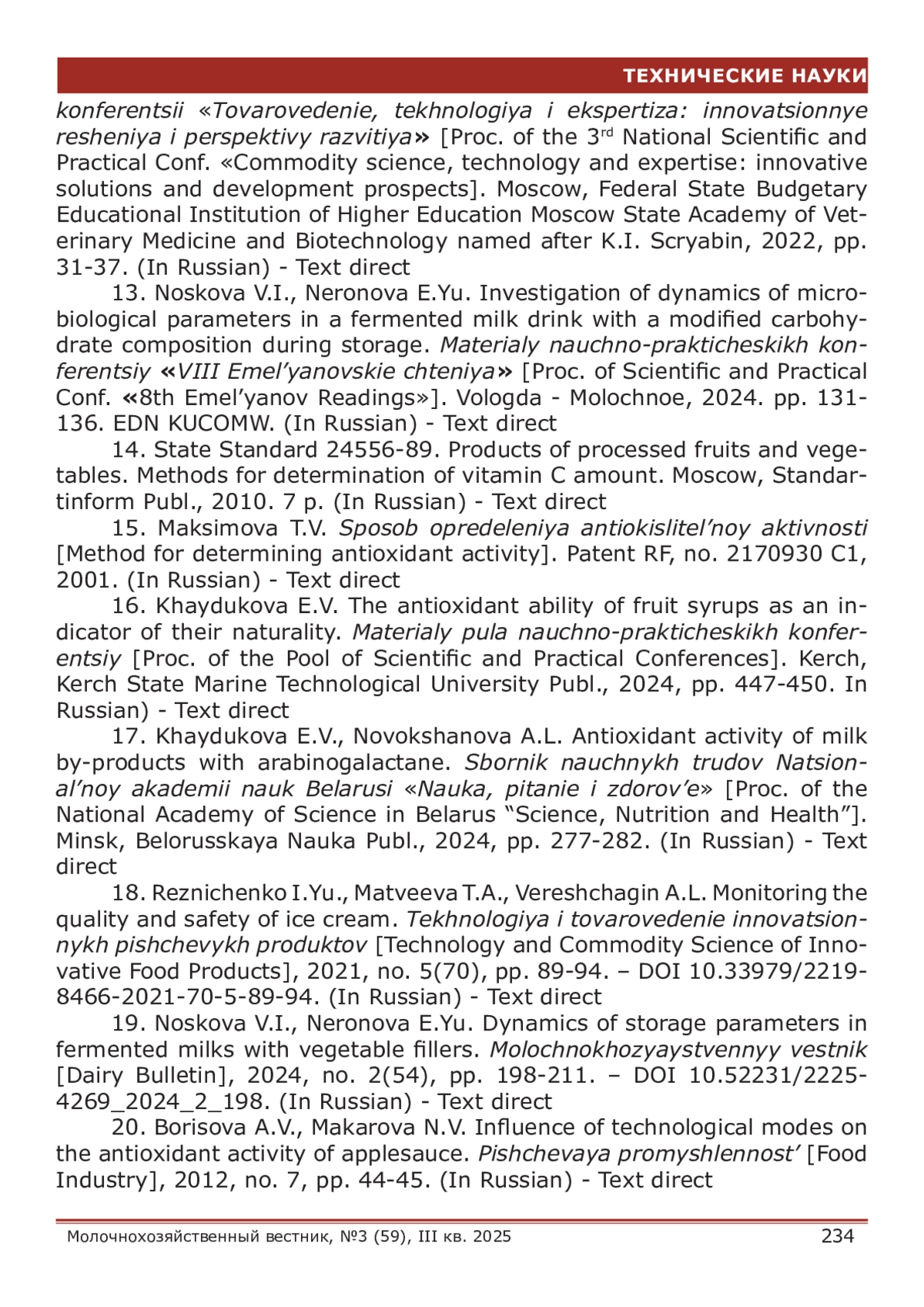 17. Хайдукова, Е.В. Антиоксидантная активность побочного молочного сырья с арабиногалактаном / Е.В. Хайдукова, А.Л. Новокшанова // Наука, питание и здоровье: сборник научных трудов / Нац. акад. наук Беларуси, Науч.-практ. центр Нац. акад. наук Беларуси по продовольствию; под общ. ред. З.В. Ловкиса. - Минск: Беларуская навука, 2024. - С. 277-282.