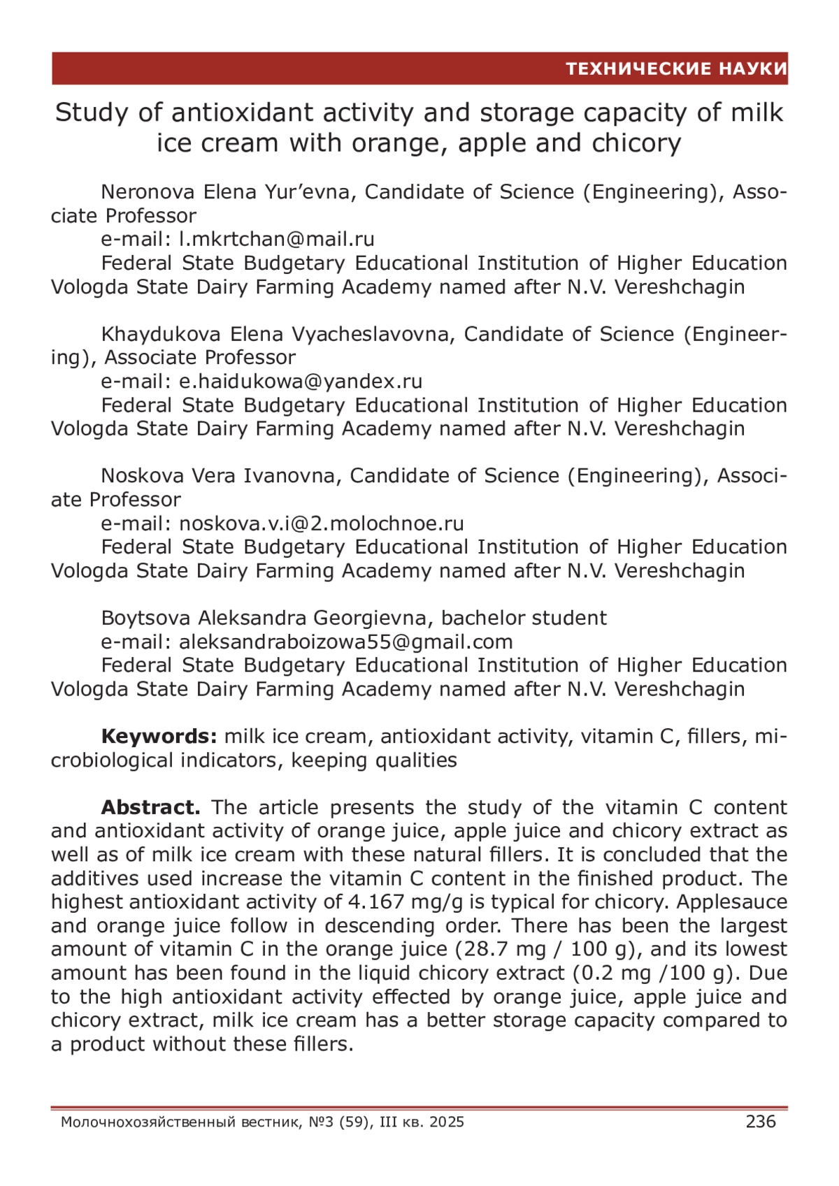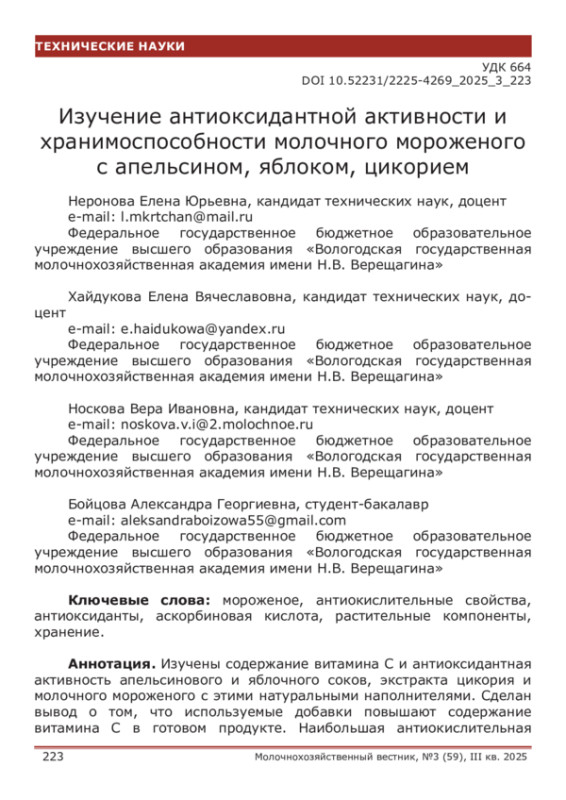 2. Христенко, Е.И. Подбор рецептур для овощного мороженого с природными сахарами / Е.И. Христенко, Е.Ю. Неронова // Передовые достижения науки в молочной отрасли: сборник научных трудов по результатам работы V Международной научно- практической конференции, Вологда-Молочное, 26 октября 2023 года. Том 1. - Вологда; Молочное: Вологодская государственная молочнохозяйственная академия им. Н.В. Верещагина, 2023. - С. 175-179.