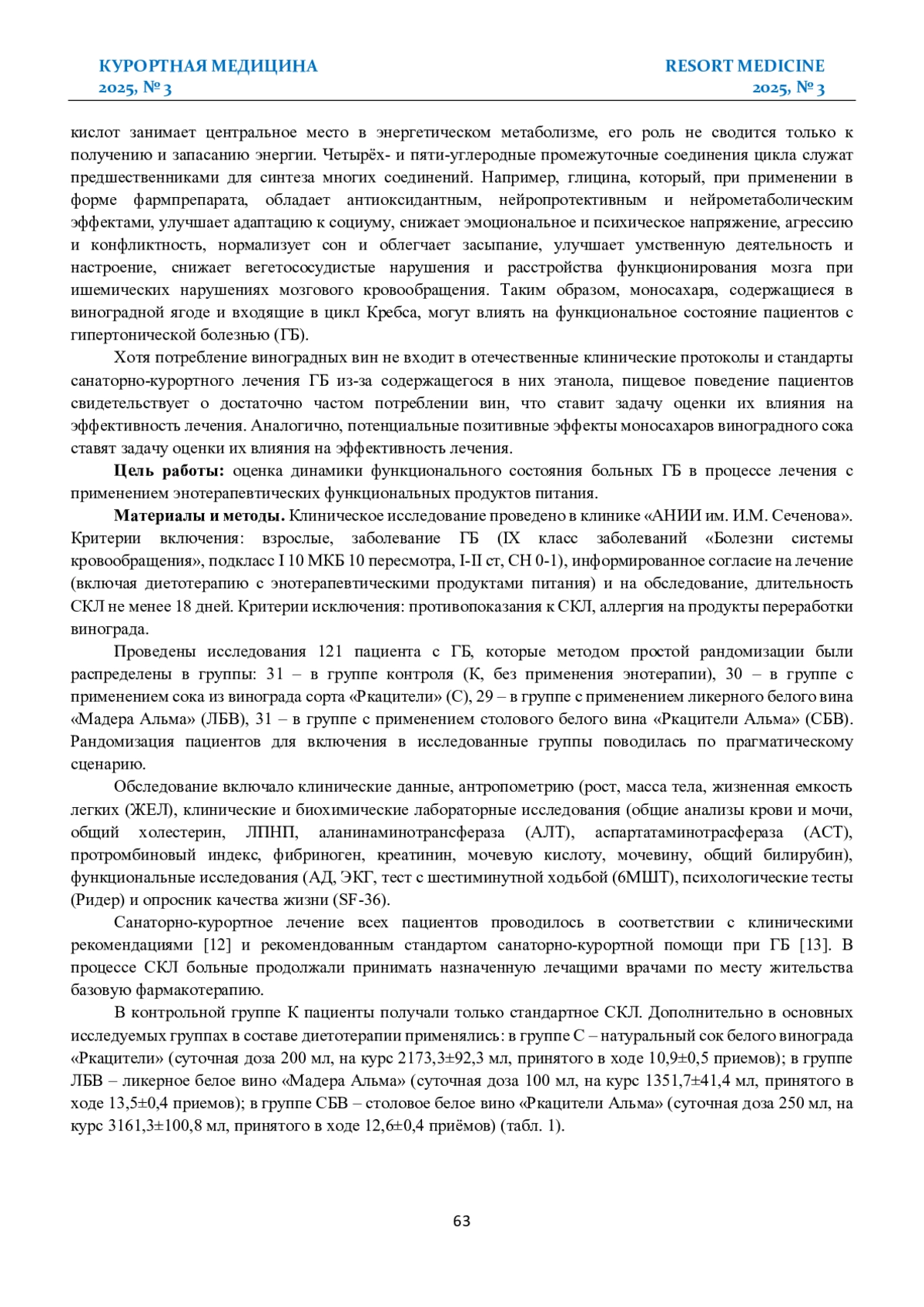 Материалы и методы. Проведены исследования 121 пациента с ГБ, которые методом простой рандомизации были распределены в группы: 31 – в группе контроля (К, без применения энотерапии), 30 – в группе с применением сока из винограда сорта «Ркацители» (С), 29 – в группе с применением ликерного белого вина «Мадера Альма» (ЛБВ), 31 – в группе с применением столового белого вина «Ркацители Альма» (СБВ).