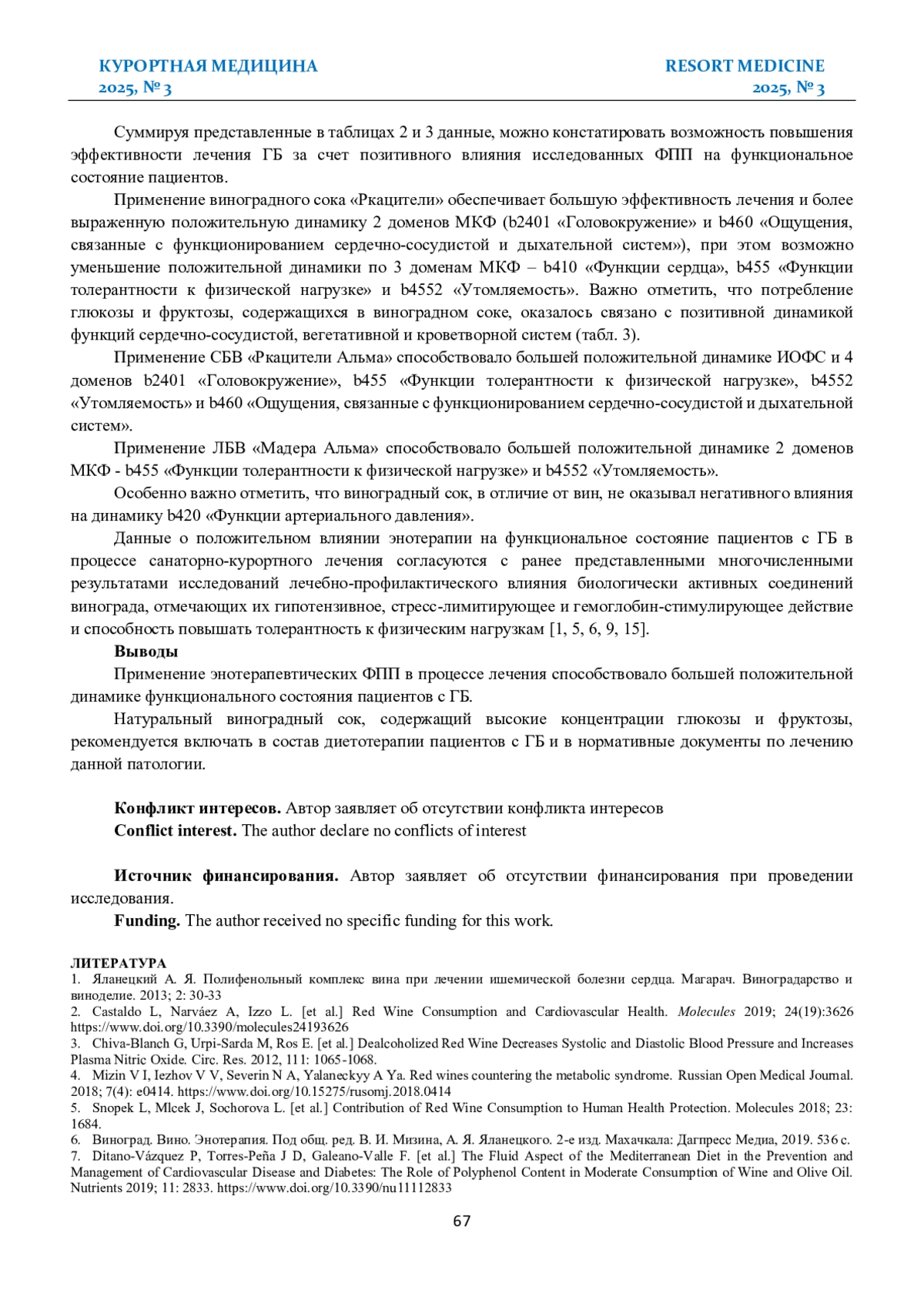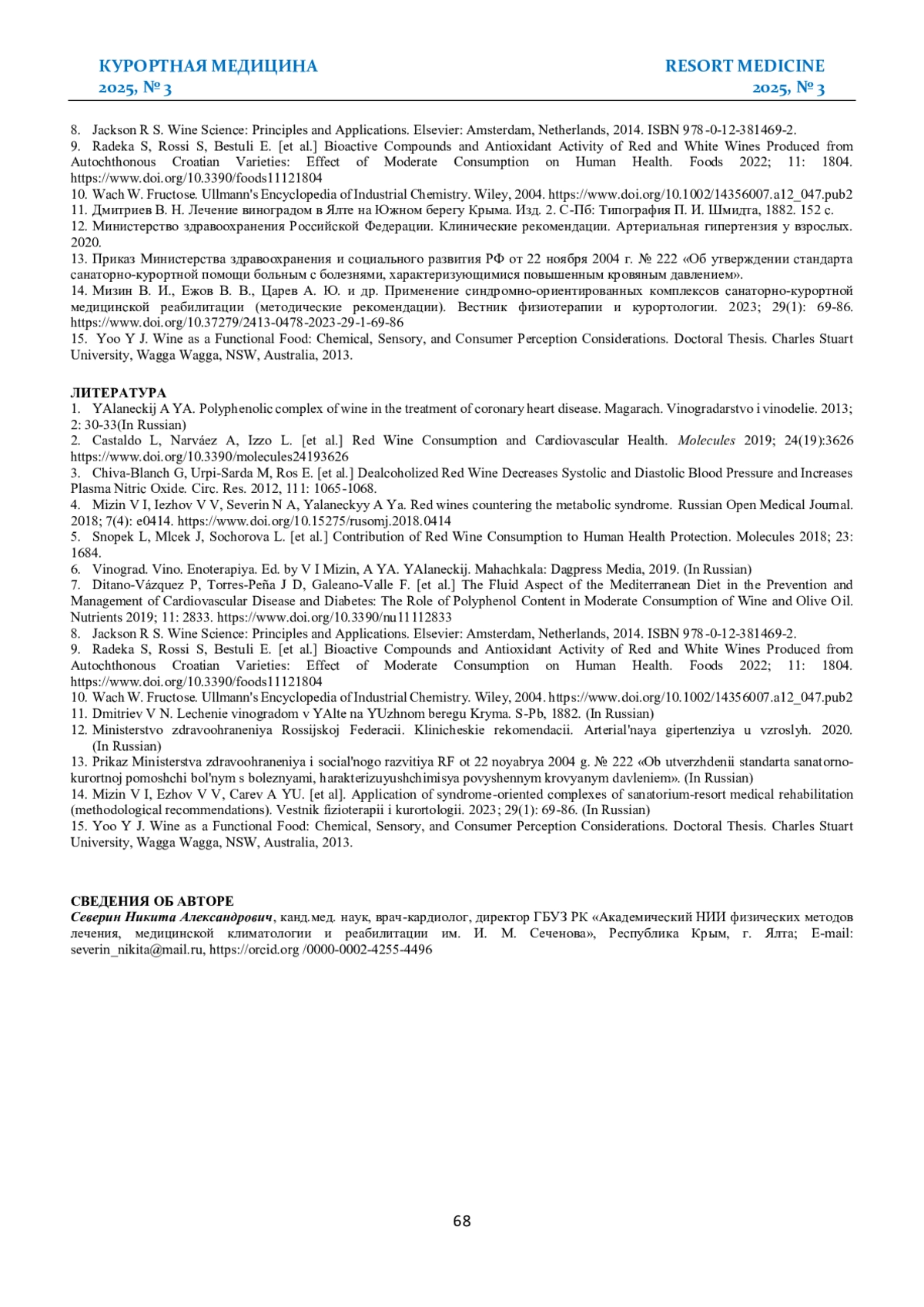 14. Мизин В. И., Ежов В. В., Царев А. Ю. и др. Применение синдромно-ориентированных комплексов санаторно-курортной медицинской реабилитации (методические рекомендации). Вестник физиотерапии и курортологии. 2023; 29(1): 69-86. https://www. DOI: 10.37279/2413-0478-2023-29-1-69-86