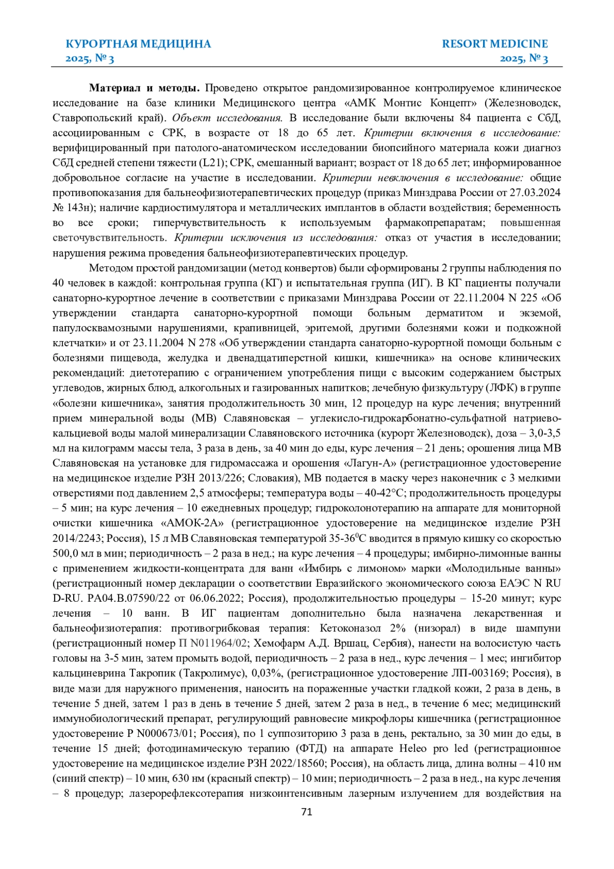 Материалы и методы. В исследование были включены 84 пациента с СбД, ассоциированным с СРК, в возрасте от 18 до 65 лет. Методом простой рандомизации были сформированы 2 группы наблюдения по 40 человек в каждой: пациенты контрольной группы (КГ) получали стандартизированное санаторно-курортное лечение, испытательной группы (ИГ) – дополнительно фотодинамическую терапию, лазерорефлексотерапию на биологически активные точки, отвечающие за состояние кожи и кишечника, рациональную фармакотерапию. Контроль эффективности был проведен по валидизированным шкалам методом анкетирования и при оценке динамических показателей трихо- и дерматоскопии, оценке качества жизни дерматологического и гастроэнтерологического больного.