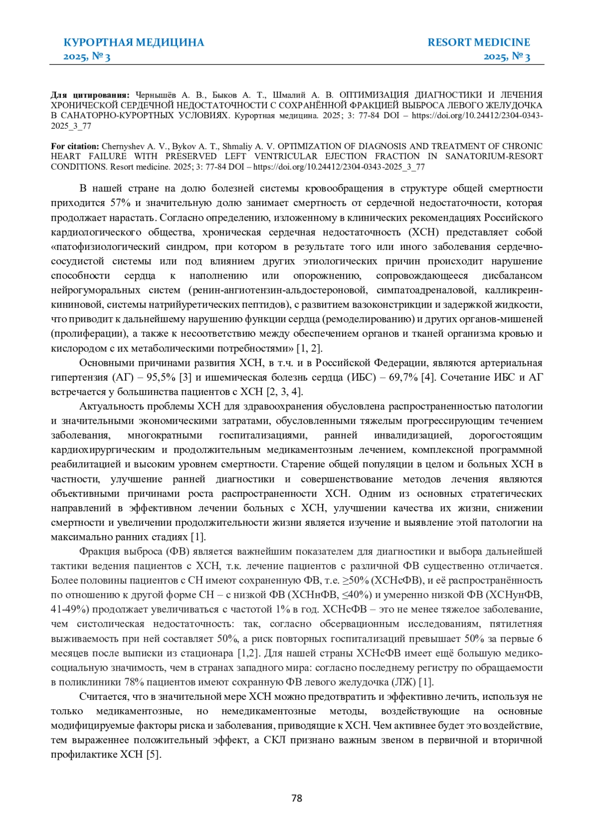 Цель исследования. Оптимизировать диагностику, профилактику и лечение хронической сердечной недостаточности с сохранённой фракцией выброса левого желудочка (ХСНсФВ) в условиях санаторно-курортного лечения (СКЛ).