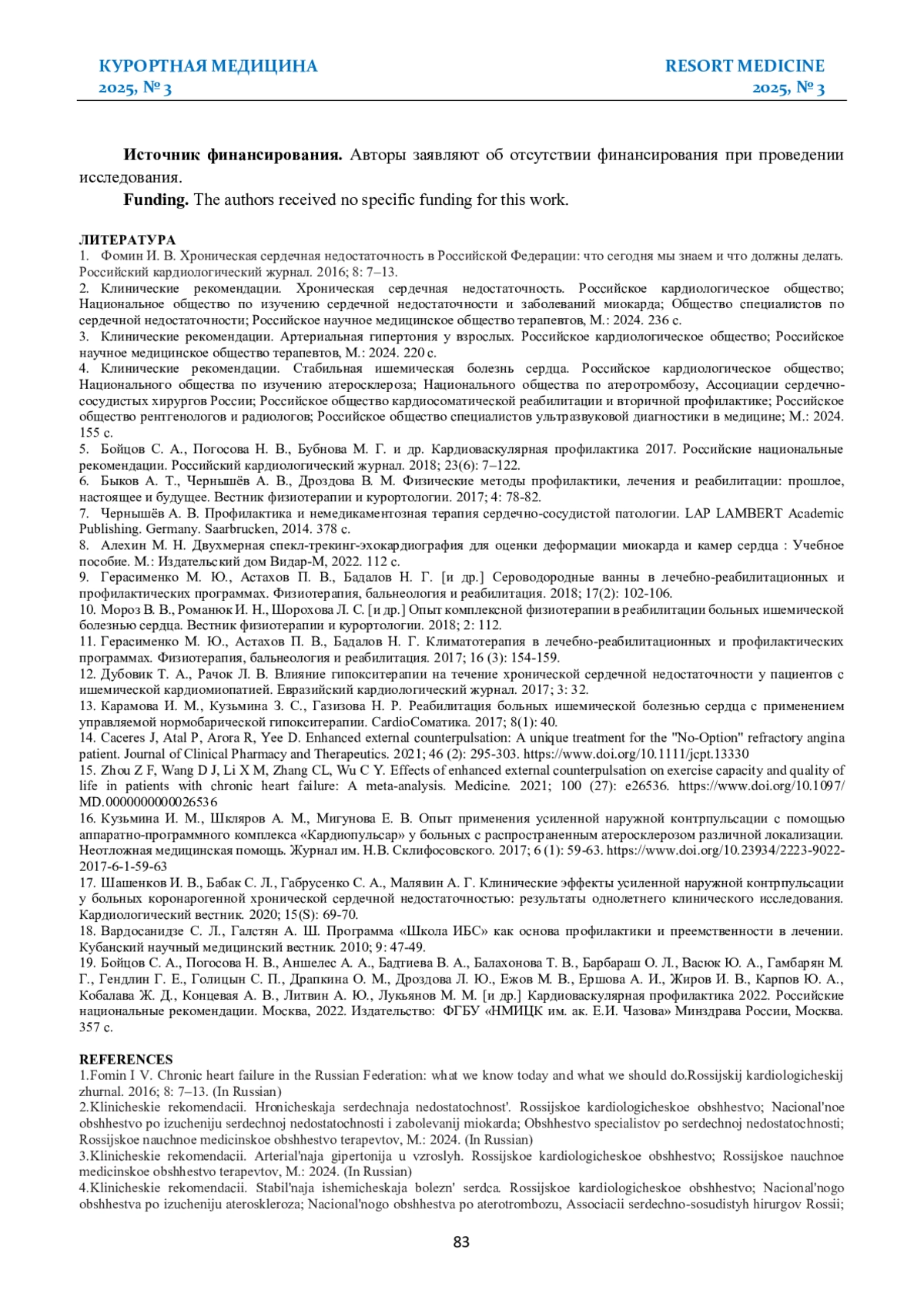 10. Мороз В. В., Романюк И. Н., Шорохова Л. С. [и др.] Опыт комплексной физиотерапии в реабилитации больных ишемической болезнью сердца. Вестник физиотерапии и курортологии. 2018; 2: 112.