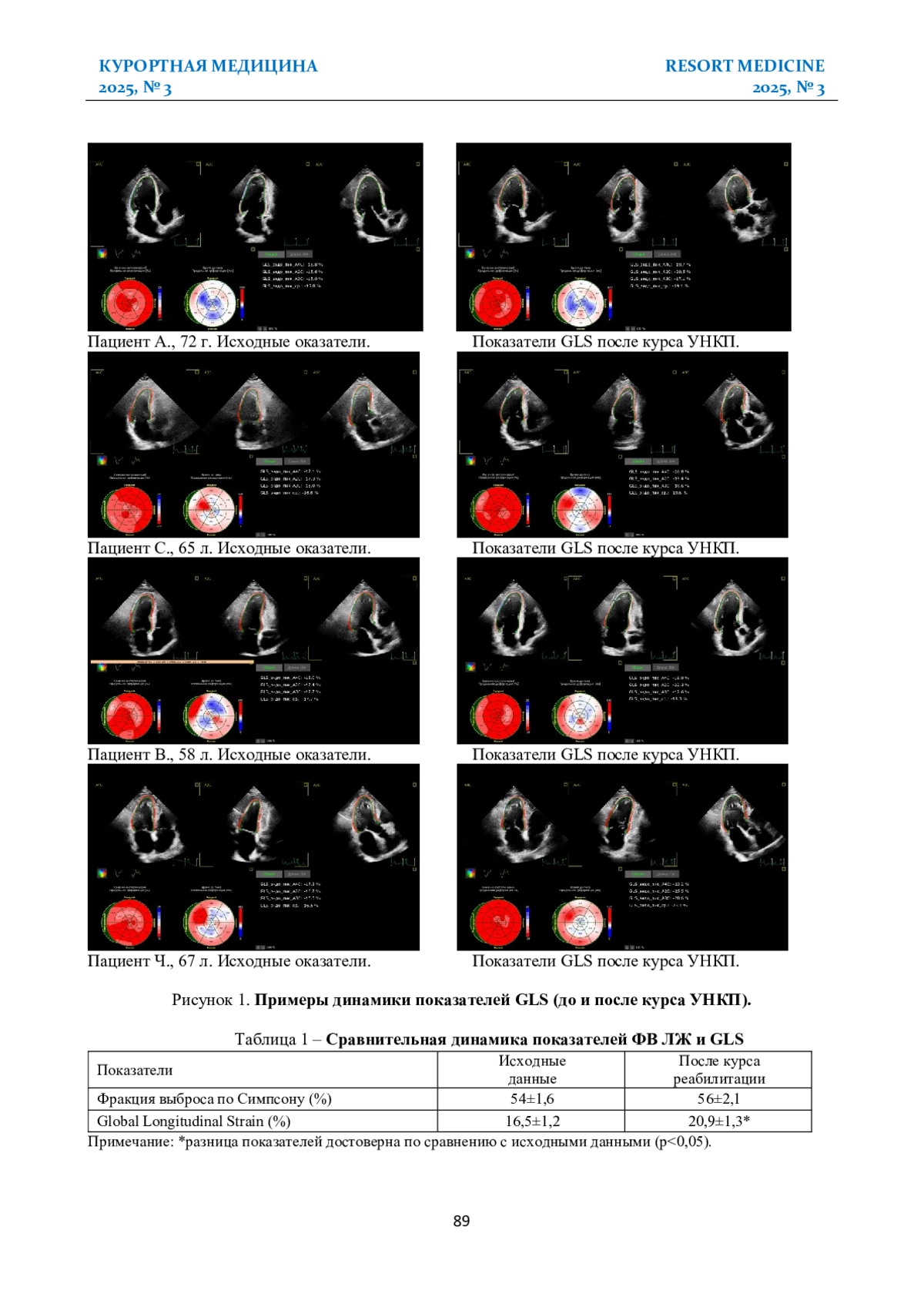 Выводы. Показана предпочтительность методики спекл-трекинг-эхокардиографии по сравнению с фракцией выброса левого желудочка для оценки сократимости миокарда в динамике. Доказано, что использование УНКП улучшает результаты санаторно-курортного лечения данной категории больных.