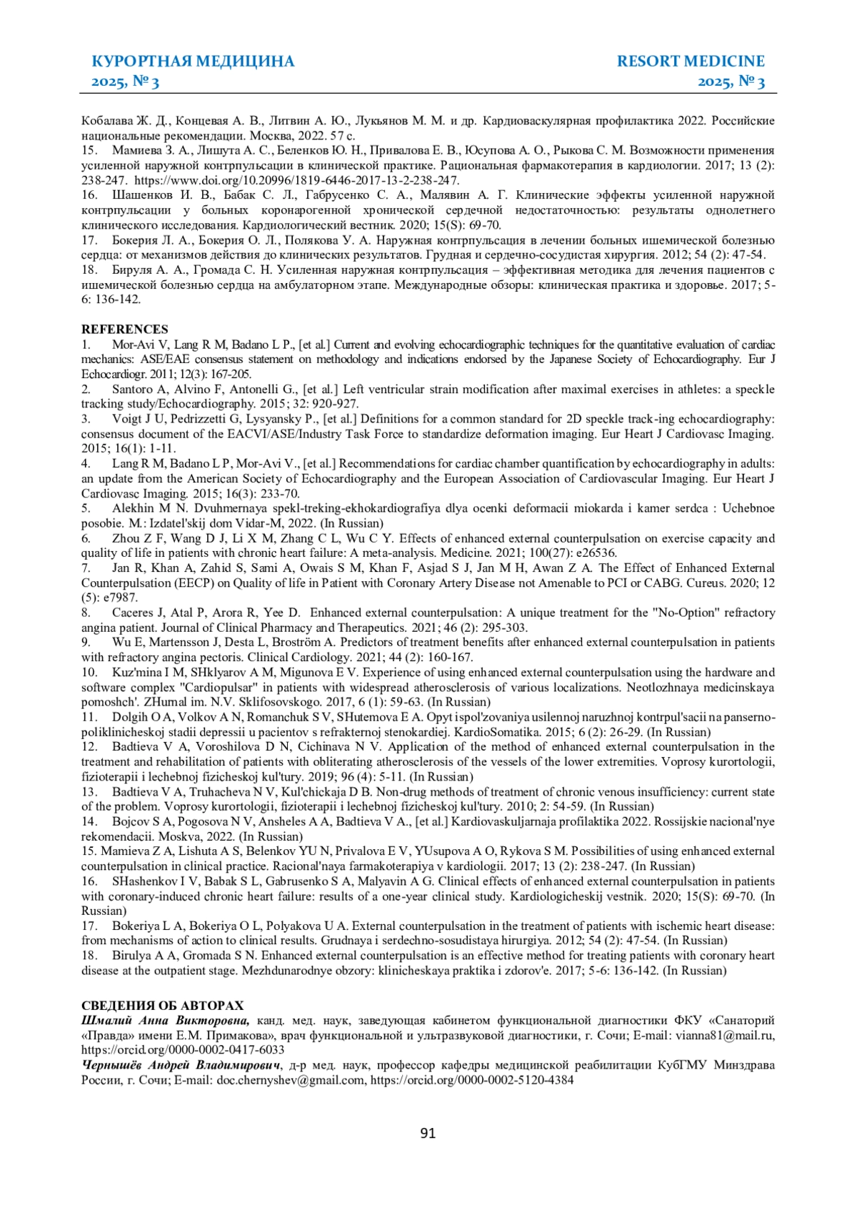 12. Бадтиева В. А., Ворошилова Д. Н., Cичинава Н. В. Применение метода усиленной наружной контрпульсации в лечении и реабилитации пациентов с облитерирующим атеросклерозом сосудов нижних конечностей. Вопросы курортологии, физиотерапии и лечебной физической культуры. 2019; 96 (4): 5-11. https://www. DOI: 10.17116/kurort2019960415