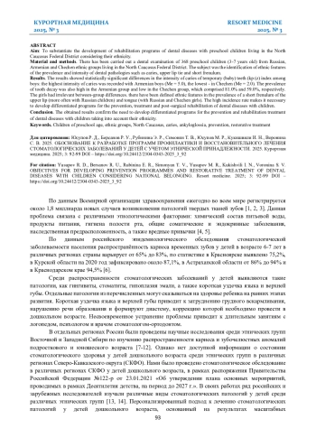 Полученные результаты. Результаты показали статистически значимые различия в интенсивности кариеса временных (молочных) зубов (индекс кп(з) среди мальчиков: наибольшая интенсивность кариеса зафиксирована у армянских мальчиков (Me=5,0), наименьшая – у чеченских (Me=2,0). Распространенность кариеса также была высокой в армянской группе и низкой – в чеченской, что составило 81,0% и 59,0%, соответственно. У девочек межгрупповые различия были незначимы. Выявлены этнические особенности в распространенности короткой уздечки верхней губы (чаще у русских детей) и языка (у русских и чеченских девочек). Высокий процент заболеваемости обусловливает необходимость разработки дифференцированных программ профилактики, лечения и постоперационной реабилитации стоматологических заболеваний у детей.