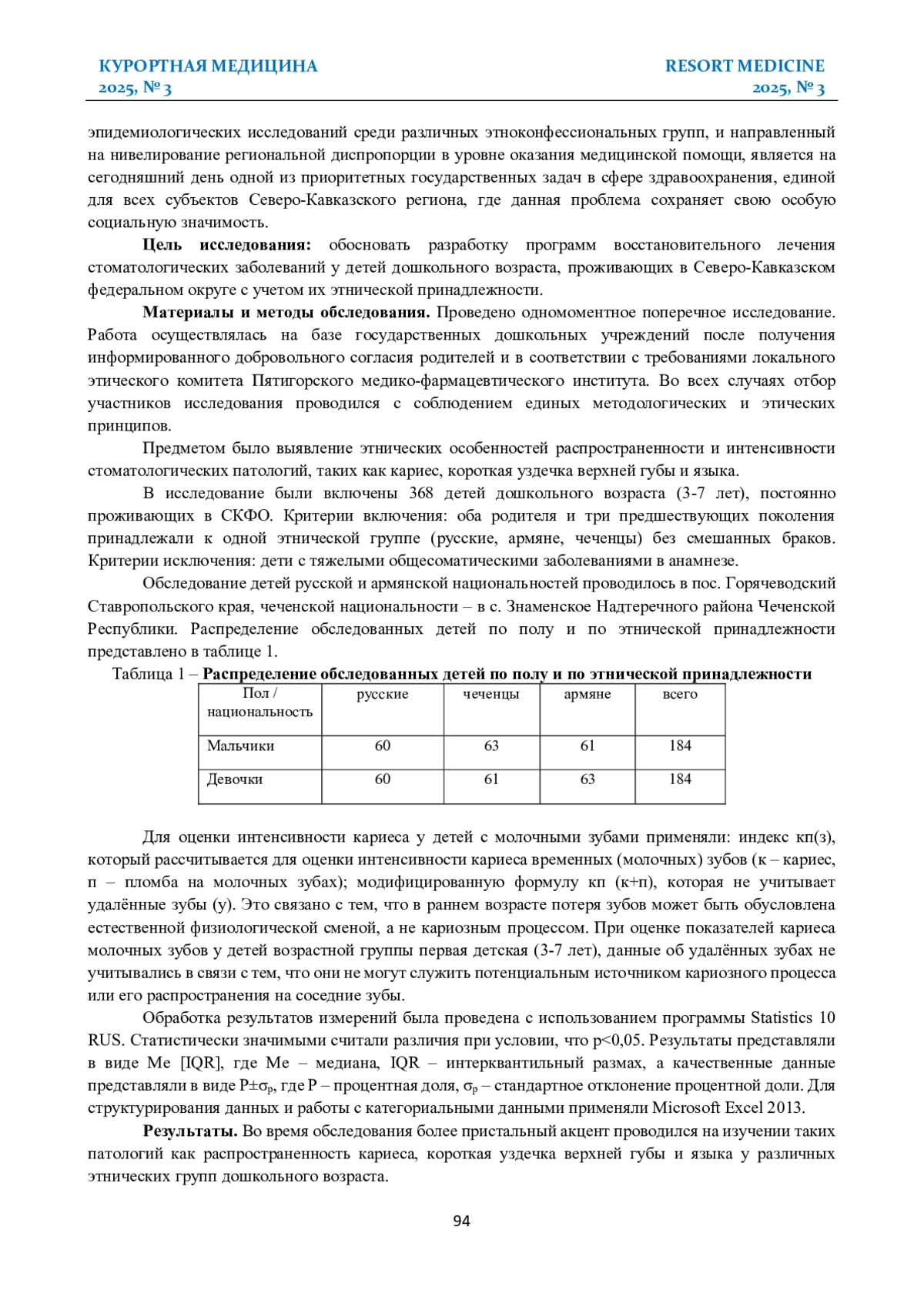 Материал и методы. Проведено стоматологическое обследование 368 детей дошкольного возраста (3-7 лет) из русской, армянской и чеченской этнических групп, проживающих в Северо-Кавказском федеральном округе. Предметом было выявление этнических особенностей распространенности и интенсивности стоматологических патологий, таких как кариес, короткая уздечка верхней губы и языка.