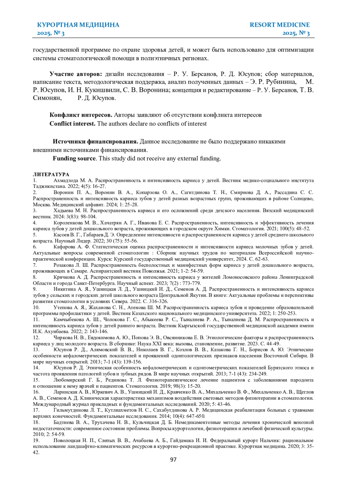 3. Хадыева М. Н. Распространенность кариеса и его осложнений среди детского населения. Вятский медицинский вестник. 2024: 3(83): 98-104.