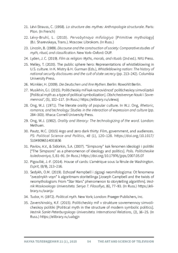 Статья основывается на идеях А. Кирби, провозгласившего в 2000-е годы наступление цифромодернистской эпохи доминирования визуальных способов повествования, и концепции «вторичной устности» У. Онга. Утверждается, что развитие медиатехнологий и насыщение повседневности визуальным контентом способствует мифологизации политического процесса. Исследование акцентирует внимание на американских сериалах и фильмах, использующих стиль псевдодокументального кино и вызывающих у зрителей иллюзию достоверности и деполитизированного восприятия вымышленных событий. Анализ мифологизации политической реальности в американском кинематографе опирается на концепцию мономифа Дж. Кэмпбелла и структуралистскую парадигму, что позволяет выявлять устойчивые мифологемы репрезентации политического процесса в массовой культуре. Кинематограф рассматривается как инструмент создания мифов, поддерживающих и легитимизирующих американскую политическую идеологию. Несмотря на жанровую и стилистическую пестроту, американские политические фильмы и сериалы образуют целостную структуру, поддерживая основные мифологемы, закрепляющие демократические ценности и идеалы. Ключевым элементом американского политического мономифа является святость институтов и федерализма, а также героизация журналистов, чиновников, простых граждан, раскрывающих государственные секреты во имя справедливости. Порочность и коррупционность отдельных политиков является фоном для репрезентации таких процессов, как выборы и межпартийные компромиссы, а также продвижения тезиса о важности СМИ в контроле государственных органов власти. Делается вывод, что массовое распространение кинематографических образов политики в конце XX века расширило доступ к наблюдению за реализацией политического процесса, предоставляя зрителю мифологические конструкции упрощенного объяснения сложных политических взаимодействий.