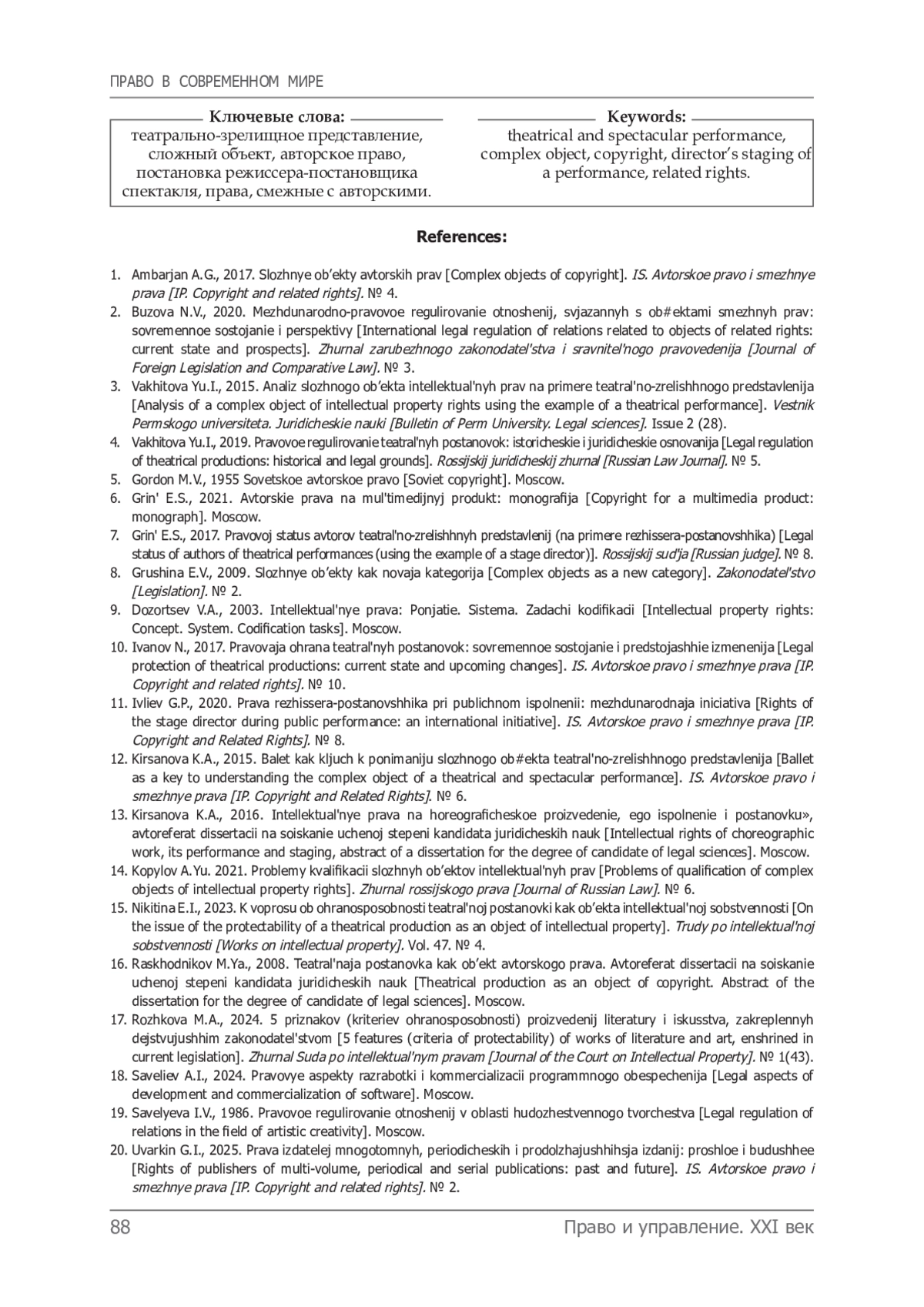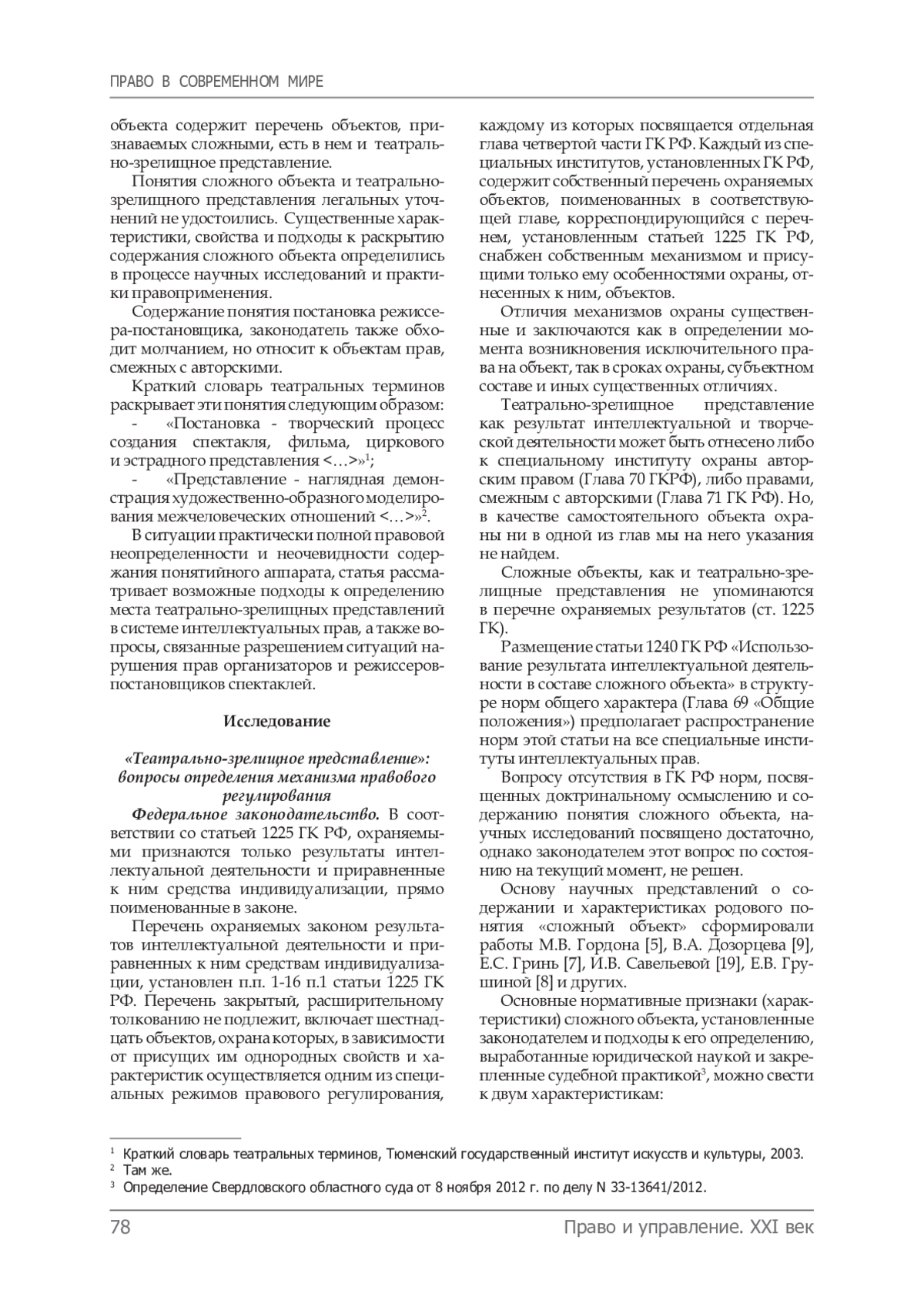3. Вахитова Ю.И. Анализ сложного объекта интеллектуальных прав на примере театрально-зрелищного представления // Вестник Пермского университета. Юридические науки. 2015. Вып. 2(28). C. 41-48.