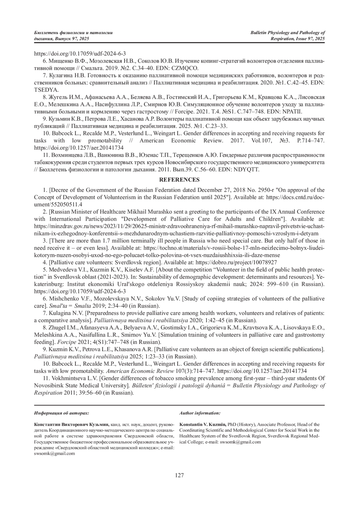 Введение. Оказание необходимой помощи паллиативным пациентам и их близким является одной из актуальных задач российского здравоохранения с учетом размера этой группы – количество неизлечимых больных, потенциально нуждающихся в паллиативном уходе, составляло в РФ в 2023 г. не менее 1,7 млн чел. Онкологические заболевания касаются 60–80% пациентов в паллиативе, в том числе это – онкология органов дыхания. Дефицит кадрового обеспечения паллиативных служб может быть частично устранен за счет привлечения волонтеров. При этом сам институт паллиативной помощи еще находится в процессе становления и важно фиксировать мотивы добровольцев для повышения качества оказываемой помощи, управления этим процессом. Цель – анализ социального портрета волонтера паллиативной медицинской помощи в Свердловской области. Материалы и методы. Исследование проведено в 2024 г.; опрошено 107 студентов Свердловского областного медицинского колледжа. Результаты. В волонтерское движение вовлечены в подавляющем большинстве студентки специальностей «Сестринское дело» и «Лечебное дело». По самооценкам респондентов, волонтерство обеспечивает развитие коммуникативных навыков, способностей к общению и пониманию собеседников, критичному восприятию профессиональных ошибок, а также повышает успеваемость в практическом обучении. Наибольшее влияние на вовлеченность в волонтерскую деятельность оказывают возможности обретения нового опыта, профессиональных знаний, умений и навыков, понимание пользы, доставляемой волонтерами больному человеку. Выделены противоречия в восприятии паллиативного волонтерства: несоответствие между развитием коммуникативных навыков и профессиональных умений волонтеров и отсутствием значимых личностных перемен в их жизни; противоречие между осознанием своей полезности и приобретением нового опыта, с одной стороны, и слабой экстраполяцией этого опыта на повышение самооценки и способности решать личные эмоциональные проблемы, с другой; несоответствие между гендерными стереотипами в обществе (уход как «женская» работа) и потребностью в привлечении волонтеров обоих полов для оказания паллиативной помощи. Заключение. Социальный портрет студента-волонтера паллиативной помощи отражает сочетание профессиональной ориентации и ценностно-эмоциональных мотивов. Несмотря на сложности, участие в волонтерской деятельности способствует формированию компетенций, востребованных в медицине, и укрепляет социальную ответственность молодежи. Для развития этой практики критически важны системная поддержка со стороны образовательных учреждений, медицинских и общественных организаций. Полученные данные дают представление о противоречиях и перспективах развития данного отряда волонтерского движения в ключе разработки соответствующих образовательных программ.
