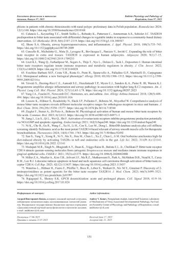 29. Grassin-Delyle S., Salvator H., Mantov N., Abrial C., Brollo M., Faisy C., Naline E., Couderc L.J., Devillier P. Bitter taste receptors (TAS2Rs) in human lung macrophages: receptor expression and inhibitory effects of TAS2R agonists // Front. Physiol. 2019. Vol.10. Article number:1267. DOI: 10.3389/fphys.2019.01267
