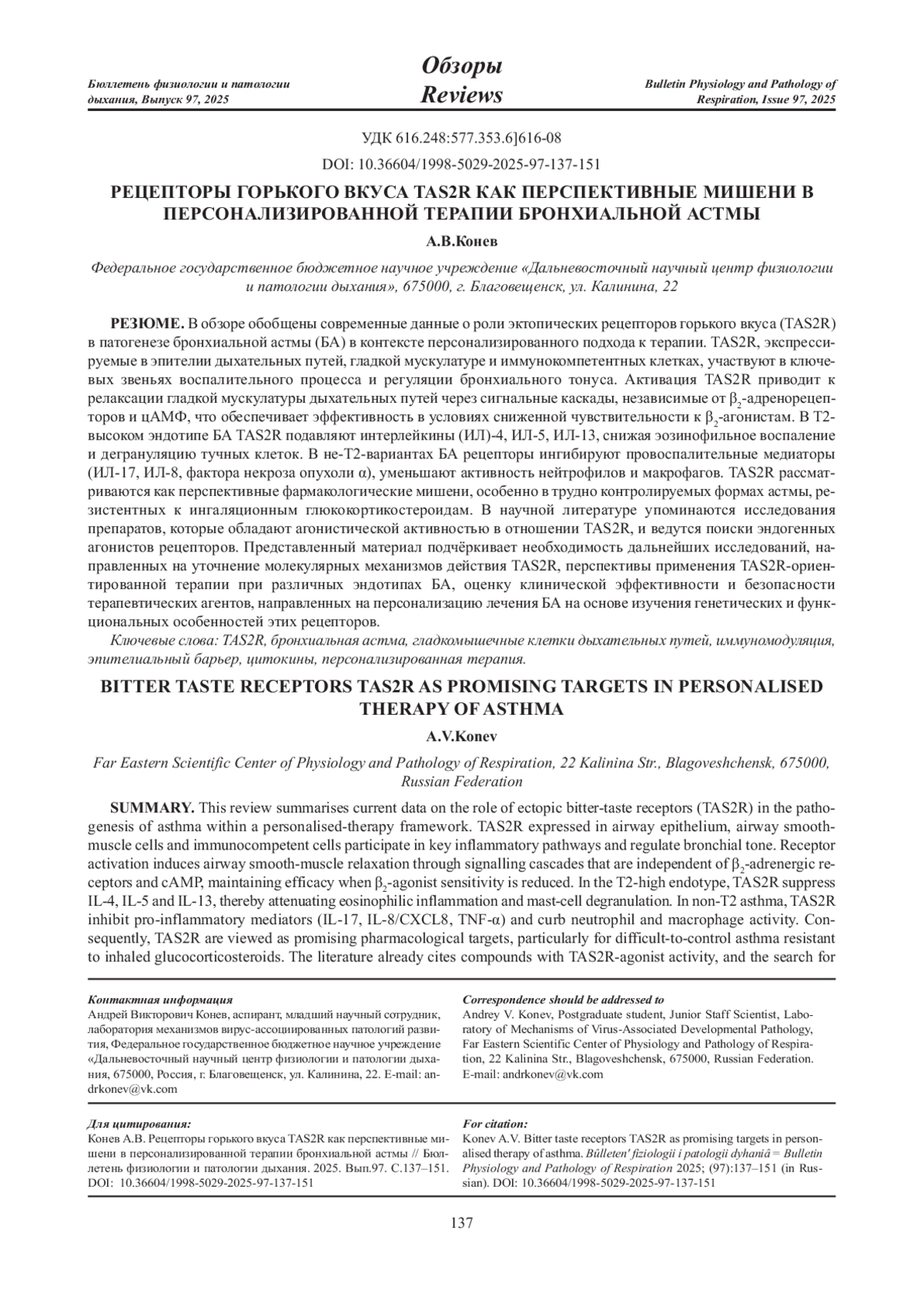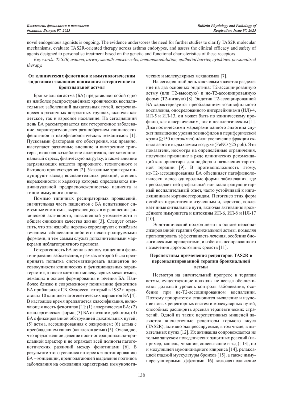 В обзоре обобщены современные данные о роли эктопических рецепторов горького вкуса (TAS2R) в патогенезе бронхиальной астмы (БА) в контексте персонализированного подхода к терапии. TAS2R, экспрессируемые в эпителии дыхательных путей, гладкой мускулатуре и иммунокомпетентных клетках, участвуют в ключевых звеньях воспалительного процесса и регуляции бронхиального тонуса. Активация TAS2R приводит к релаксации гладкой мускулатуры дыхательных путей через сигнальные каскады, независимые от β2-адренорецепторов и цАМФ, что обеспечивает эффективность в условиях сниженной чувствительности к β2-агонистам. В Т2- высоком эндотипе БА TAS2R подавляют интерлейкины (ИЛ)-4, ИЛ-5, ИЛ-13, снижая эозинофильное воспаление и дегрануляцию тучных клеток. В не-Т2-вариантах БА рецепторы ингибируют провоспалительные медиаторы (ИЛ-17, ИЛ-8, фактора некроза опухоли α), уменьшают активность нейтрофилов и макрофагов. TAS2R рассматриваются как перспективные фармакологические мишени, особенно в трудно контролируемых формах астмы, резистентных к ингаляционным глюкокортикостероидам. В научной литературе упоминаются исследования препаратов, которые обладают агонистической активностью в отношении TAS2R, и ведутся поиски эндогенных агонистов рецепторов. Представленный материал подчёркивает необходимость дальнейших исследований, направленных на уточнение молекулярных механизмов действия TAS2R, перспективы применения TAS2R-ориентированной терапии при различных эндотипах БА, оценку клинической эффективности и безопасности терапевтических агентов, направленных на персонализацию лечения БА на основе изучения генетических и функциональных особенностей этих рецепторов.