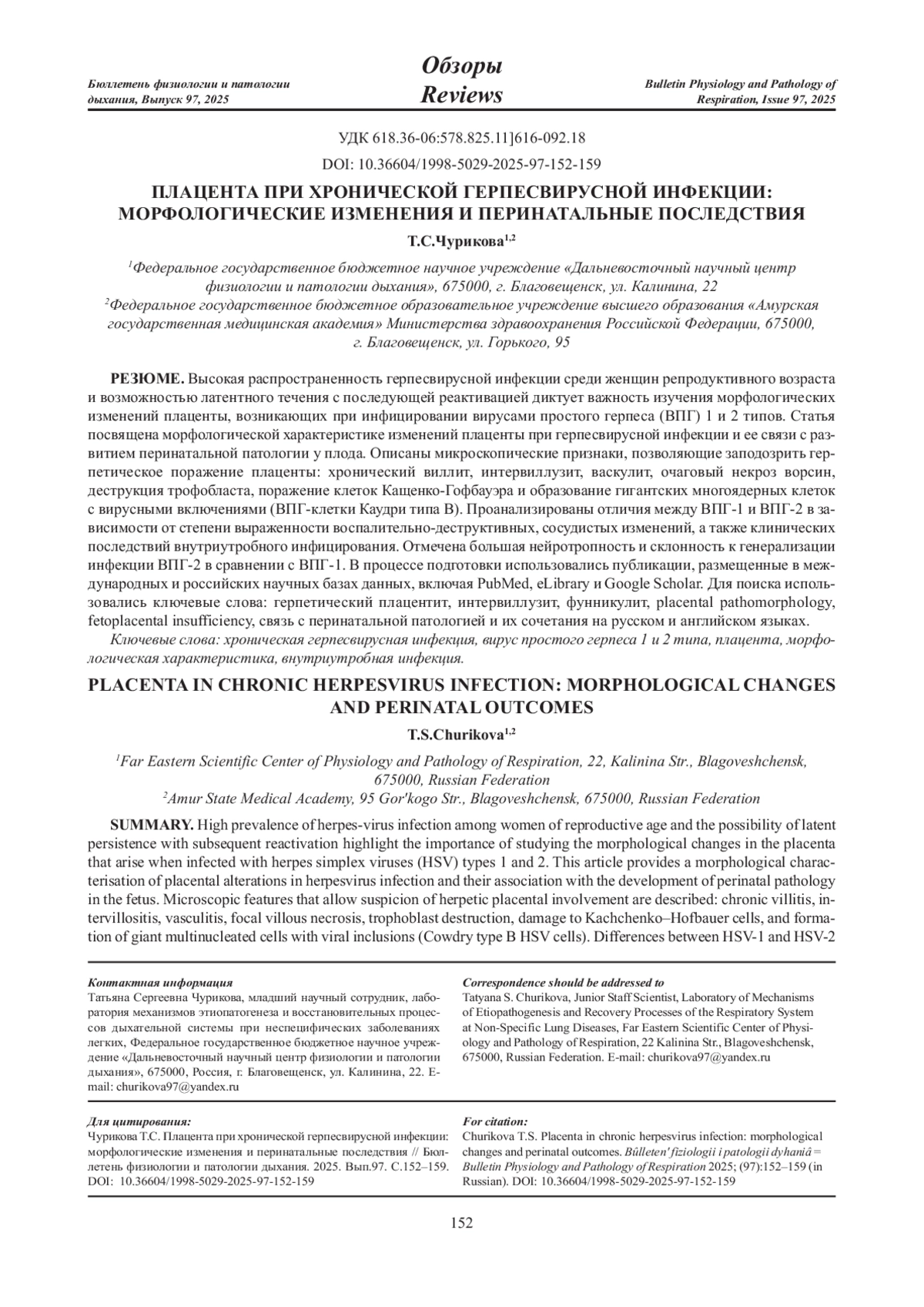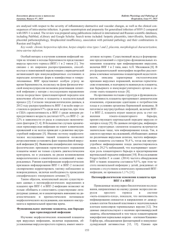 Высокая распространенность герпесвирусной инфекции среди женщин репродуктивного возраста и возможностью латентного течения с последующей реактивацией диктует важность изучения морфологических изменений плаценты, возникающих при инфицировании вирусами простого герпеса (ВПГ) 1 и 2 типов. Статья посвящена морфологической характеристике изменений плаценты при герпесвирусной инфекции и ее связи с развитием перинатальной патологии у плода. Описаны микроскопические признаки, позволяющие заподозрить герпетическое поражение плаценты: хронический виллит, интервиллузит, васкулит, очаговый некроз ворсин, деструкция трофобласта, поражение клеток Кащенко-Гофбауэра и образование гигантских многоядерных клеток с вирусными включениями (ВПГ-клетки Каудри типа В). Проанализированы отличия между ВПГ-1 и ВПГ-2 в зависимости от степени выраженности воспалительно-деструктивных, сосудистых изменений, а также клинических последствий внутриутробного инфицирования. Отмечена большая нейротропность и склонность к генерализации инфекции ВПГ-2 в сравнении с ВПГ-1. В процессе подготовки использовались публикации, размещенные в международных и российских научных базах данных, включая PubMed, eLibrary и Google Scholar. Для поиска использовались ключевые слова: герпетический плацентит, интервиллузит, фунникулит, placental pathomorphology, fetoplacental insufficiency, связь с перинатальной патологией и их сочетания на русском и английском языках.