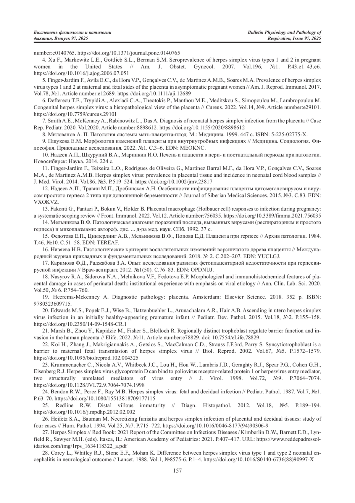 24. Bendon R.W., Perez F., Ray M.B. Herpes simplex virus: fetal and decidual infection // Pediatr. Pathol. 1987. Vol.7, №1. P.63-70. DOI: 10.1080/15513818709177115