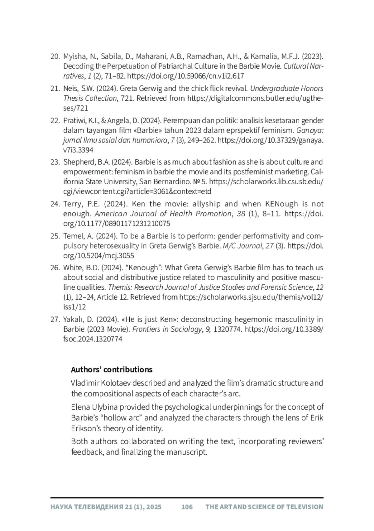 27. Yakalı, D. (2024). “He is just Ken”: deconstructing hegemonic masculinity in Barbie (2023 Movie). Frontiers in Sociology, 9, 1320774. DOI: 10.3389/fsoc.2024.1320774 EDN: GCYTYI