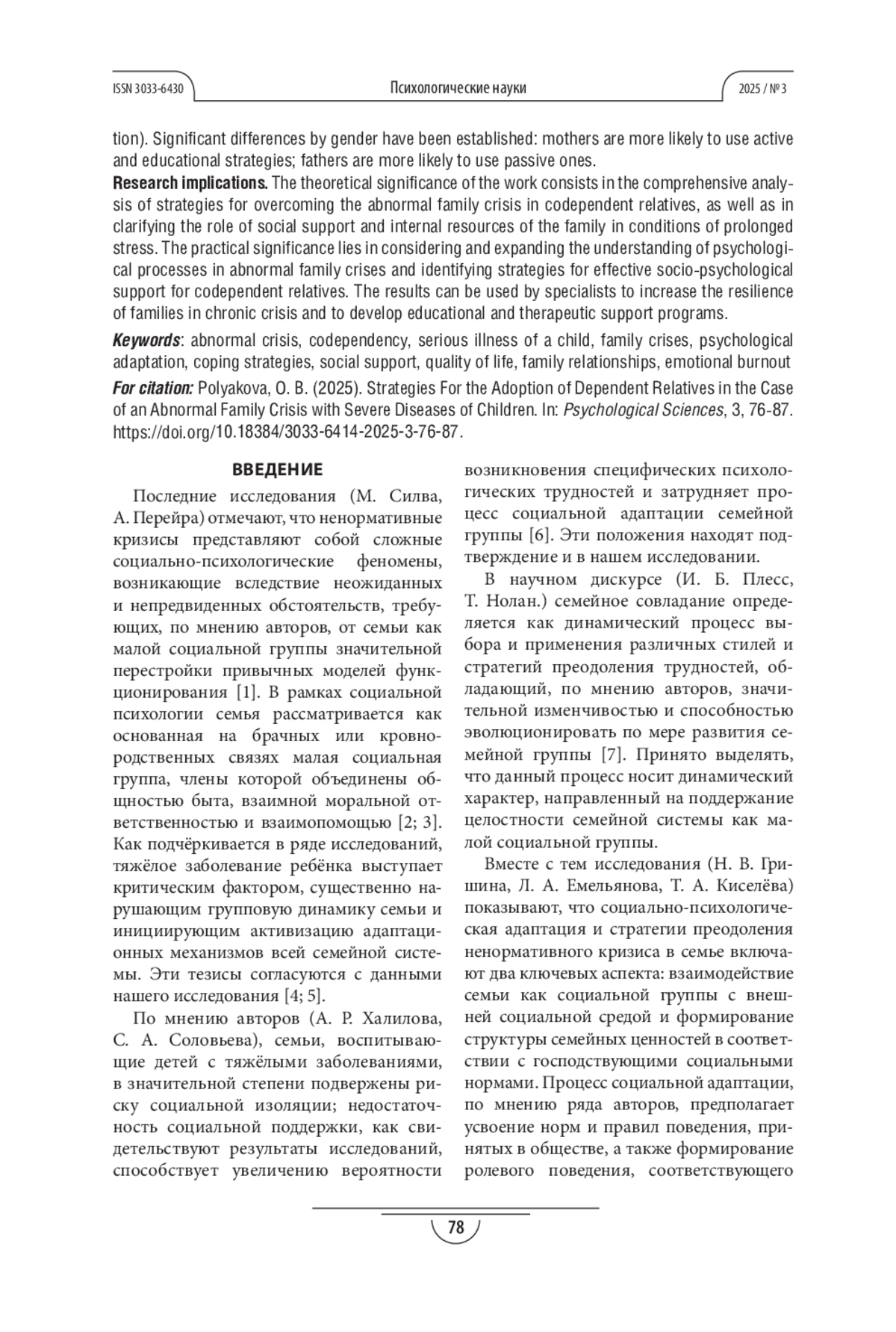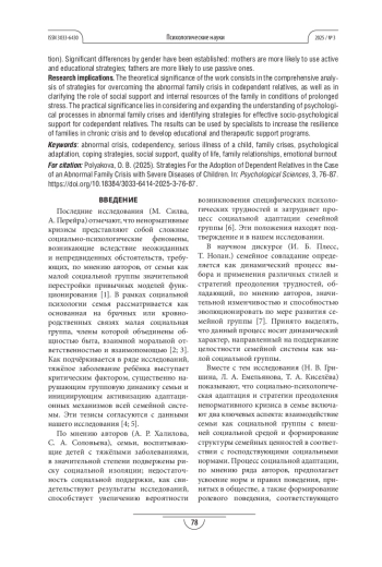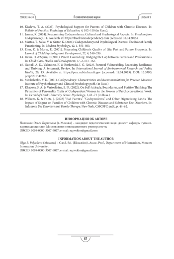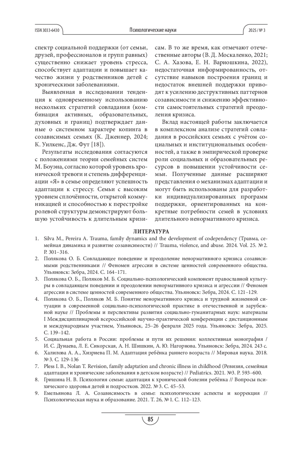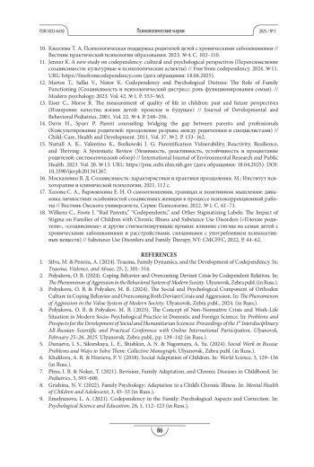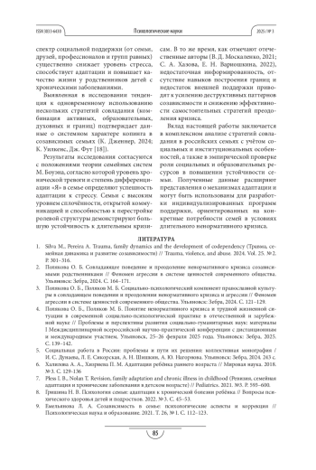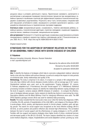 ПОЛЯКОВА О. Б. СТРАТЕГИИ АДАПТАЦИИ СОЗАВИСИМЫХ РОДСТВЕННИКОВ В УСЛОВИЯХ НЕНОРМАТИВНОГО СЕМЕЙНОГО КРИЗИСА ПРИ ТЯЖЁЛЫХ ЗАБОЛЕВАНИЯХ ДЕТЕЙ // ПСИХОЛОГИЧЕСКИЕ НАУКИ. 2025. № 3