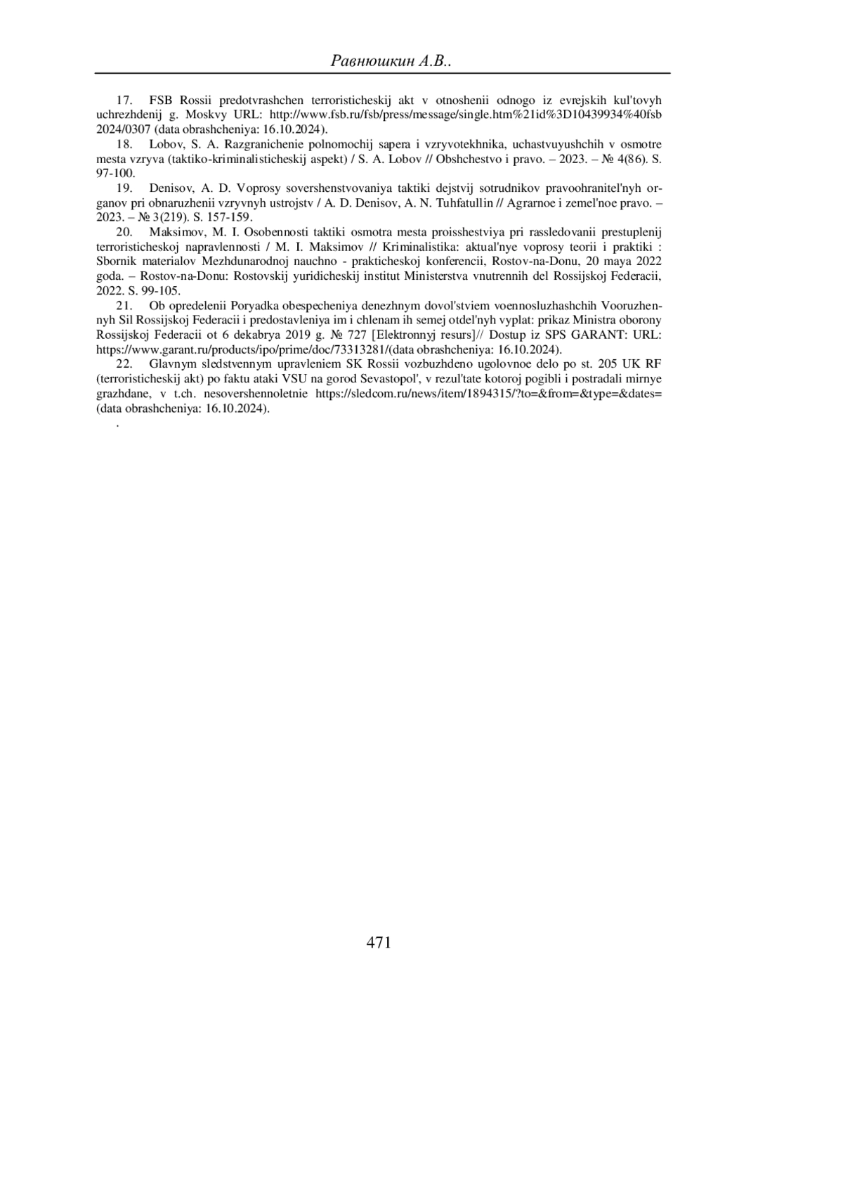 РАВНЮШКИН А. В. ОСОБЕННОСТИ ОСМОТРА МЕСТА СОВЕРШЕНИЯ ТЕРРОРИСТИЧЕСКОГО АКТА В СОВРЕМЕННЫХ УСЛОВИЯХ // УЧЕНЫЕ ЗАПИСКИ КРЫМСКОГО ФЕДЕРАЛЬНОГО УНИВЕРСИТЕТА ИМЕНИ В. И. ВЕРНАДСКОГО. ЮРИДИЧЕСКИЕ НАУКИ. 2025. ТОМ 11(77). №1