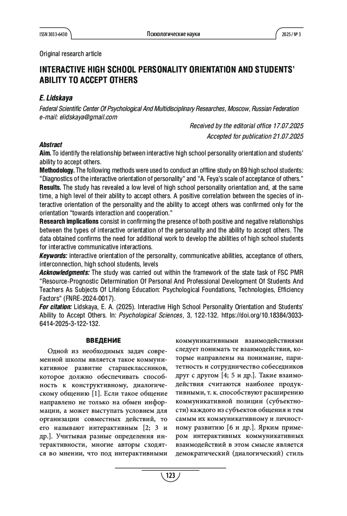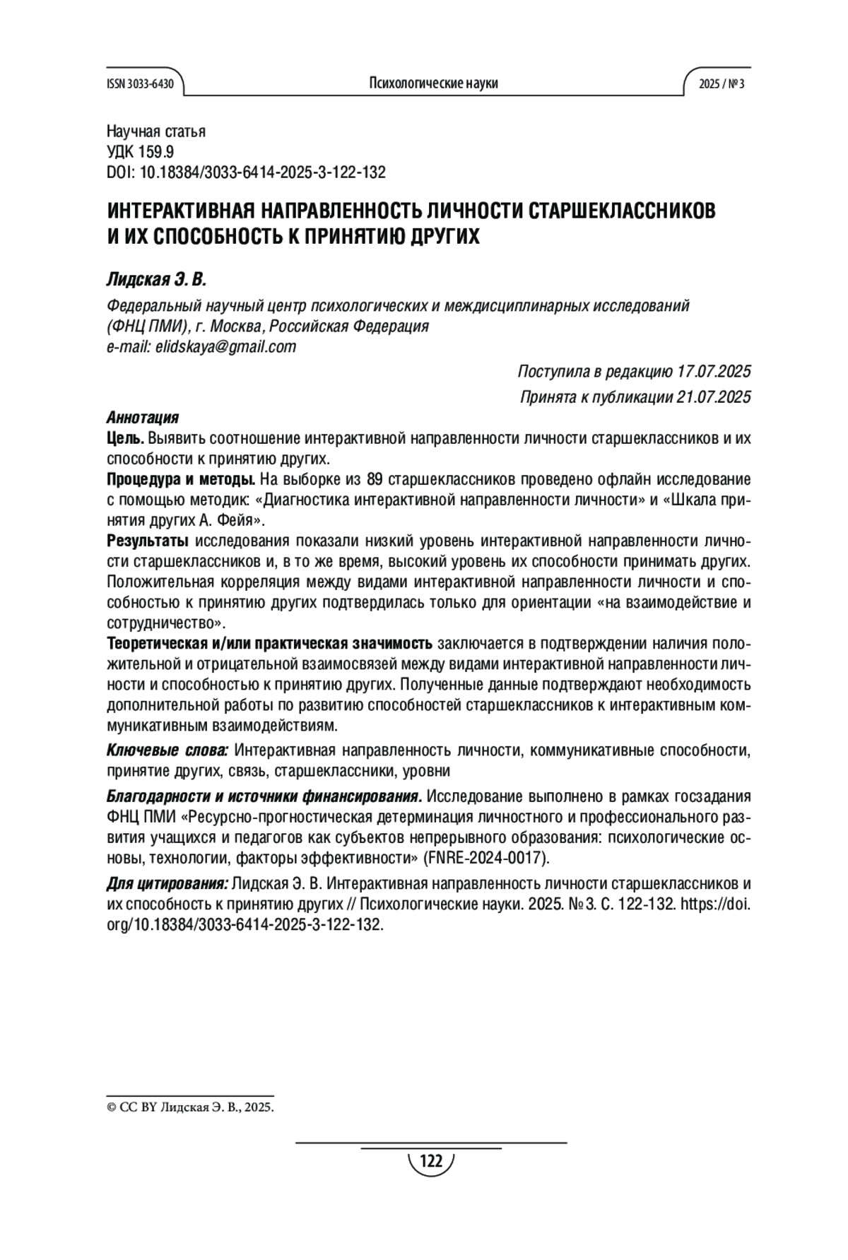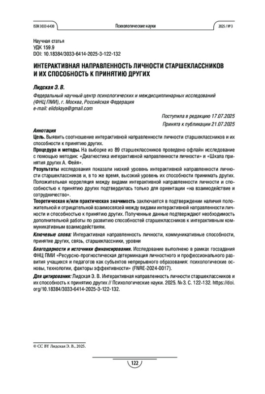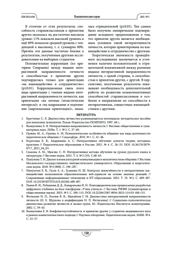 Теоретическая и/или практическая значимость заключается в подтверждении наличия положительной и отрицательной взаимосвязей между видами интерактивной направленности личности и способностью к принятию других. Полученные данные подтверждают необходимость дополнительной работы по развитию способностей старшеклассников к интерактивным коммуникативным взаимодействиям.