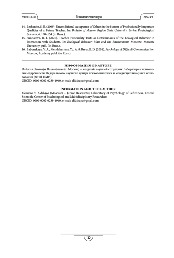 15. Суннатова Р. И. Личностные особенности учителей как детерминанты экологичности поведения педагогов во взаимодействии с обучающимися // Экологичность поведения: человек и окружающая среда. М.: Издательство Московского университета, 2025. С. 81-93.
