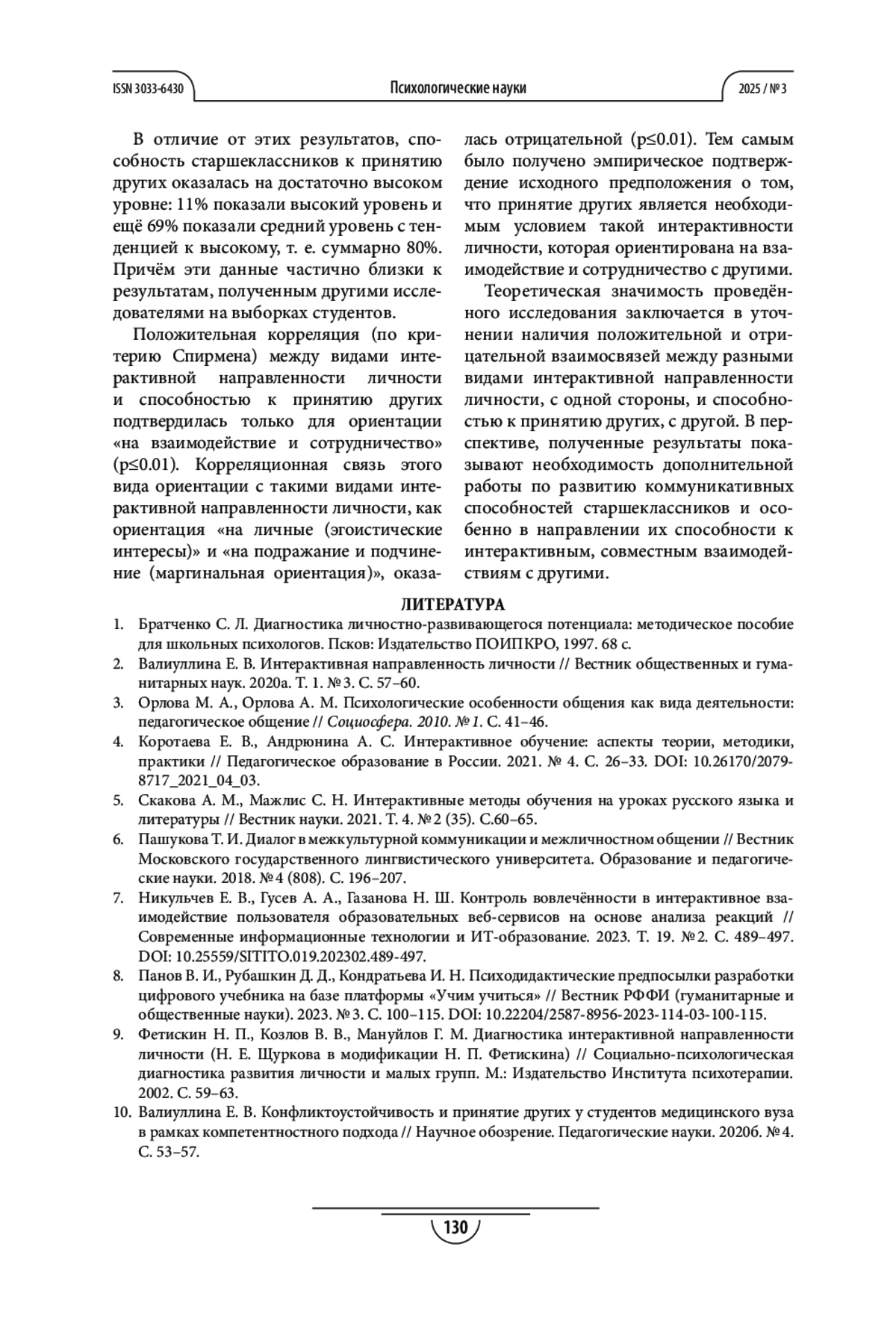 2. Валиуллина Е. В. Интерактивная направленность личности // Вестник общественных и гуманитарных наук. 2020а. Т. 1. № 3. С. 57-60.