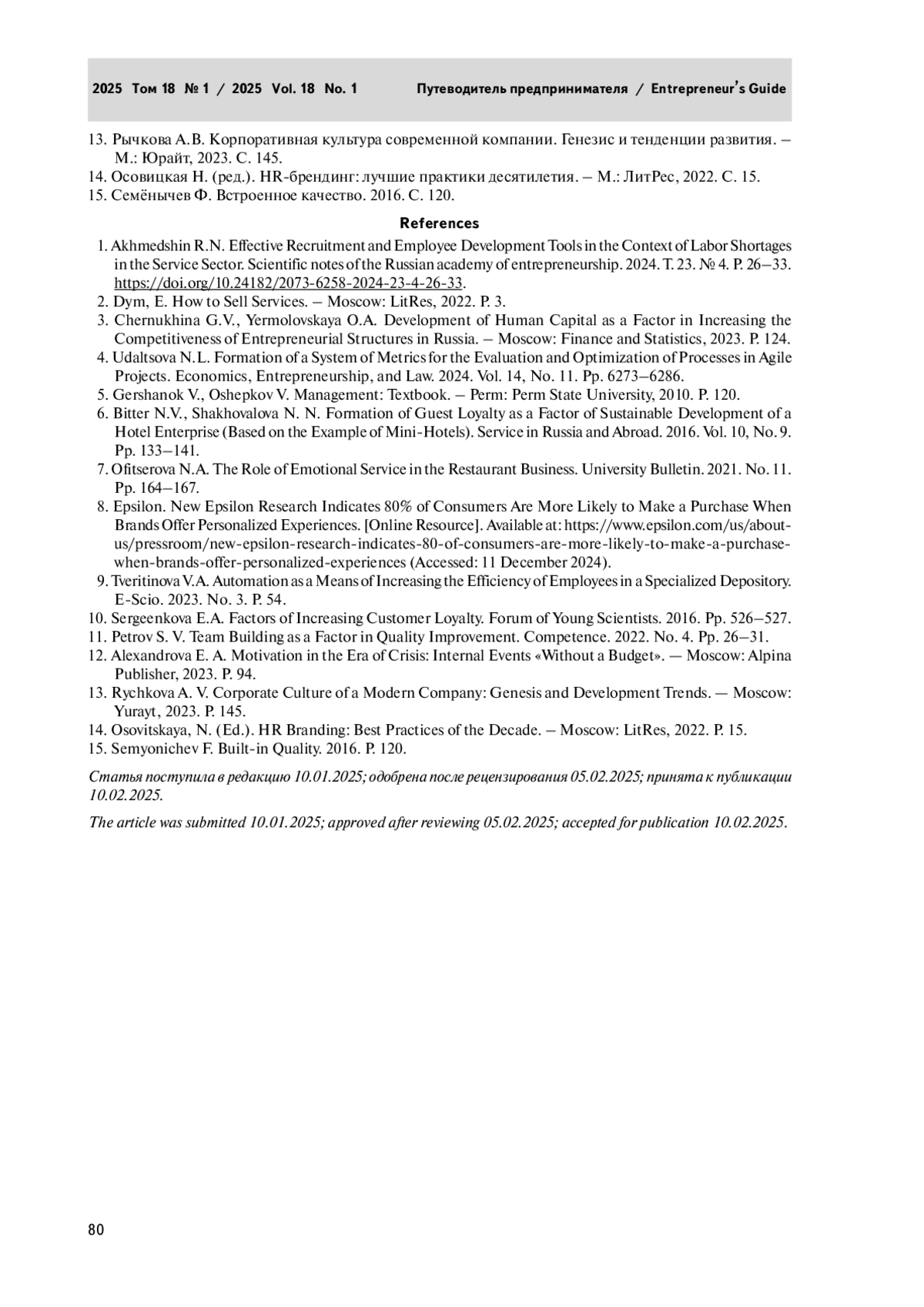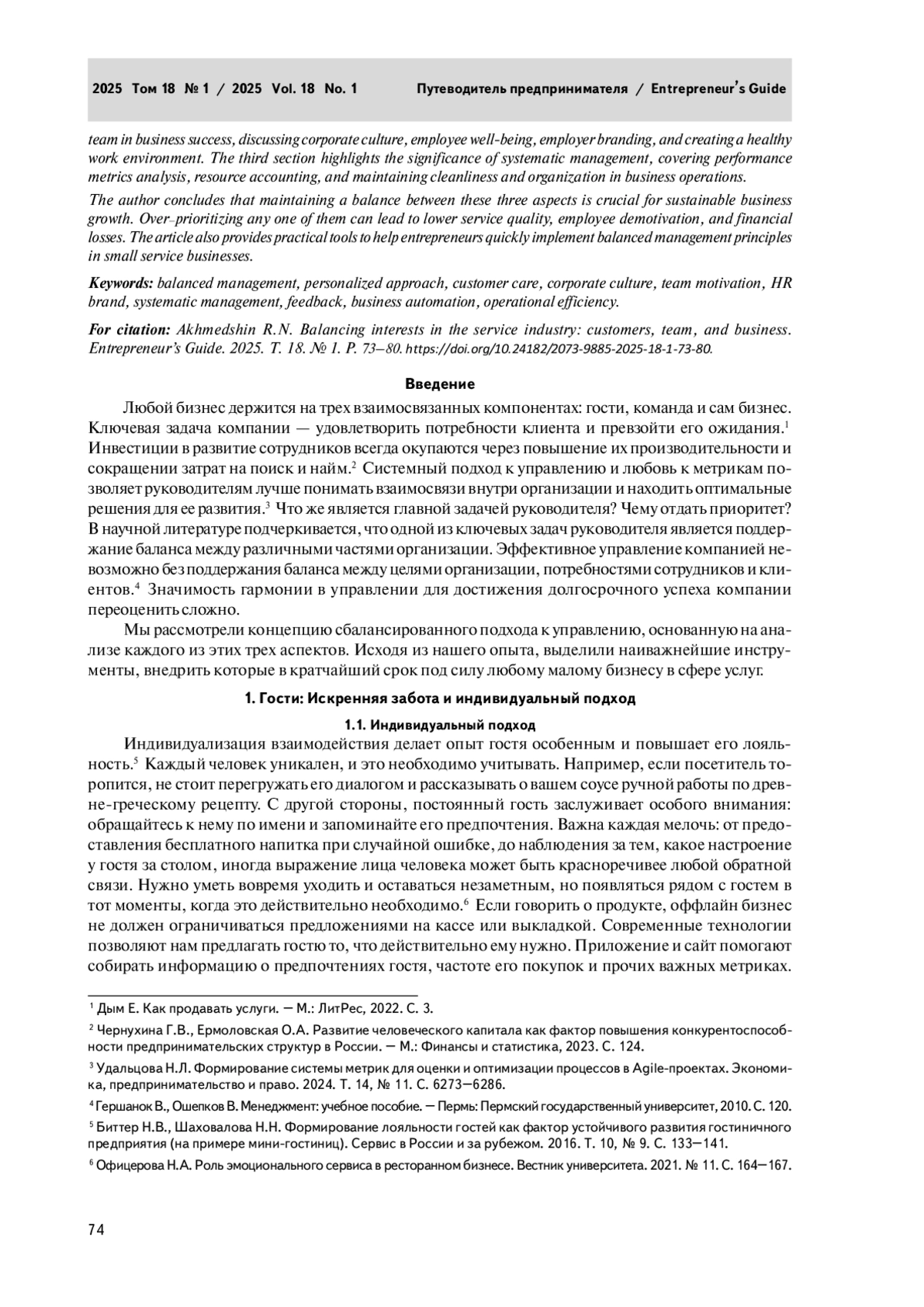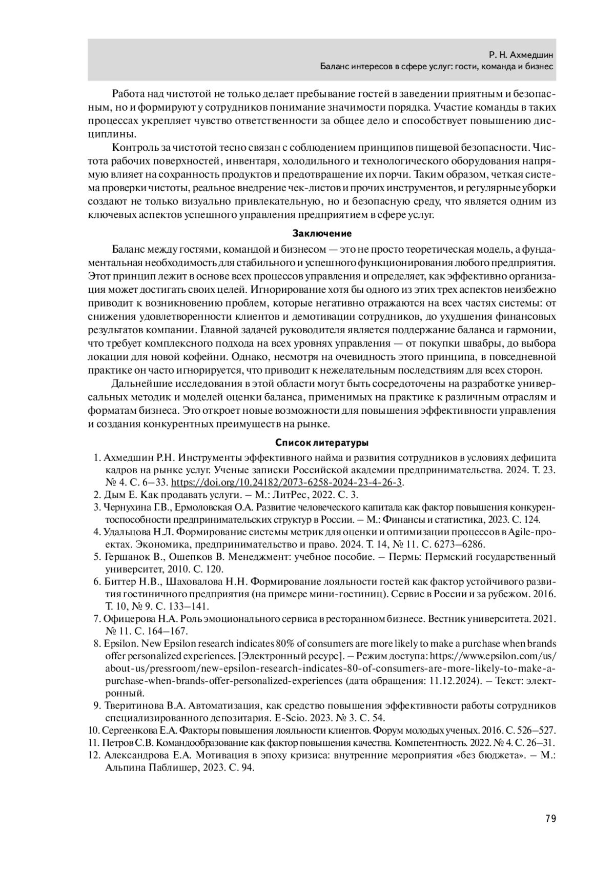 АХМЕДШИН Р. Н. БАЛАНС ИНТЕРЕСОВ В СФЕРЕ УСЛУГ: ГОСТИ, КОМАНДА И БИЗНЕС // РОССИЙСКАЯ АКАДЕМИЯ ПРЕДПРИНИМАТЕЛЬСТВА. 2025. Т. 18, № 1