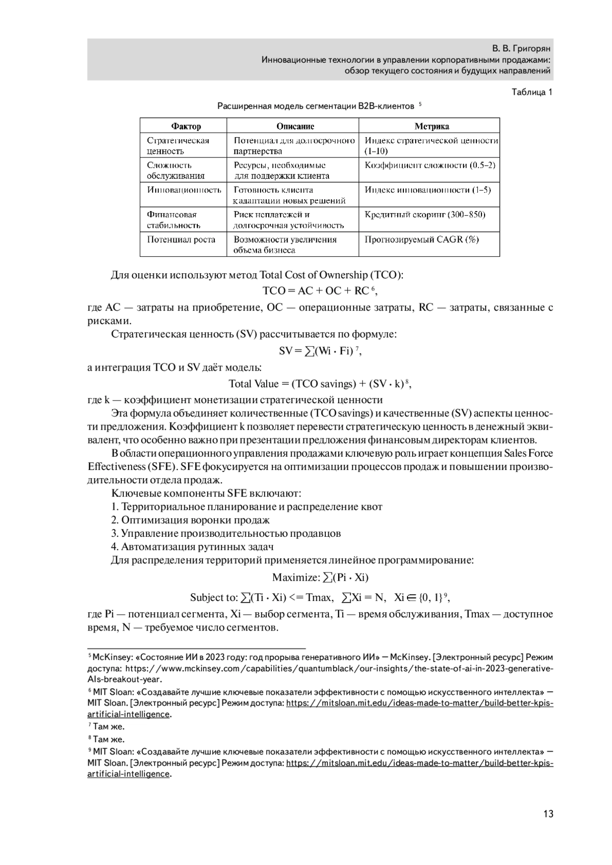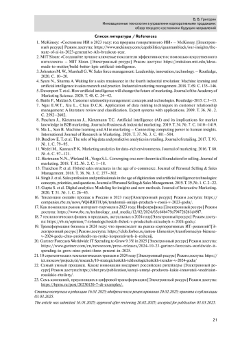 В исследовании анализируются текущее состояние и перспективы развития инновационных технологий в управлении корпоративными продажами. Рассмотрены теоретические основы управления продажами и влияние технологий, таких как искусственный интеллект, аналитика больших данных, блокчейн и IoT. Результаты подтверждают переход к предиктивным, data–driven подходам в продажах благодаря конвергенции этих технологий. Выявлены основные проблемы внедрения, включая вопросы безопасности данных и необходимость адаптации организации. Успешная интеграция этих технологий может обеспечить конкурентные преимущества за счёт улучшения понимания клиентов, оптимизации процессов и создания новых моделей взаимодействия.
