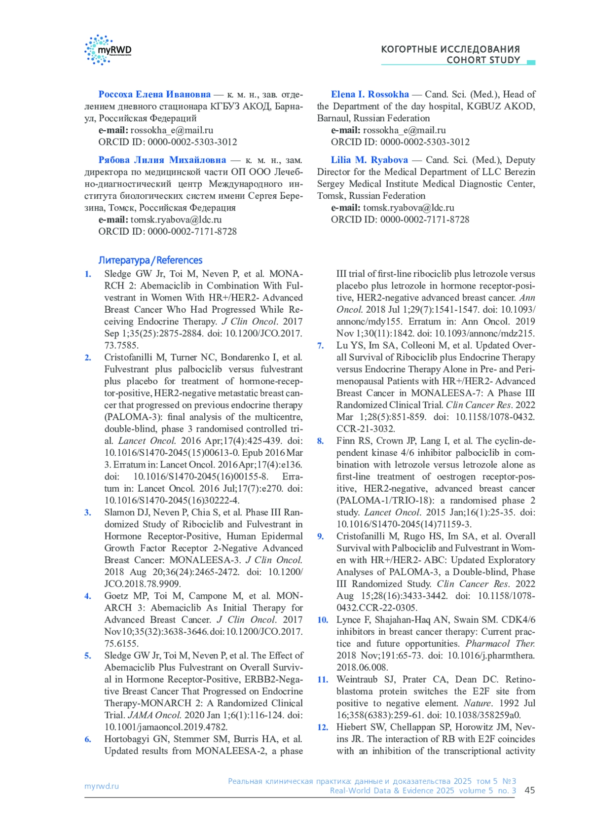 3. Slamon DJ, Neven P, Chia S, et al. Phase III Randomized Study of Ribociclib and Fulvestrant in Hormone Receptor-Positive, Human Epidermal Growth Factor Receptor 2-Negative Advanced Breast Cancer: MONALEESA-3. J Clin Oncol. 2018 Aug 20;36(24):2465-2472. 10.1200/ JCO.2018.78.9909. DOI: 10.1200/JCO.2018.78.9909 EDN: SHJBWH
