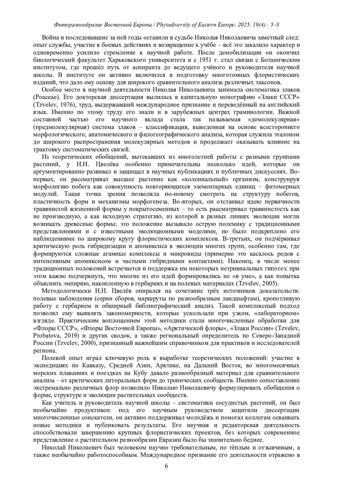 Николай Николаевич Цвелёв родился 31 января 1925 г. и стал одной из самых значимых фигур российской систематики XX века: выдающийся специалист по флористике и систематике сосудистых растений, сотрудник Ботанического института им. В. Л. Комарова РАН, автор фундаментальных монографий и редактор крупных флористических сводок. Его научный путь охватывает более полувека интенсивной полевой и гербарной работы, и по многим направлениям он оставил непреходящее наследие, которым продолжают пользоваться исследователи и в настоящее время (Geltman, 2015; Saksonov, Senator, 2015; Geltman et al., 2016; Tatanov, 2019).