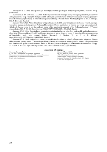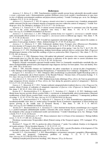 1. Антонова И. С., Белова О. А. 2008. Трансформация модулей разных уровней кроны некоторых древесных растений в связи с условиями среды и фитоценотической позицией // Вестник Тверского гос. ун-та. Сер. Биология и экология. Вып. 9. С. 10-16.