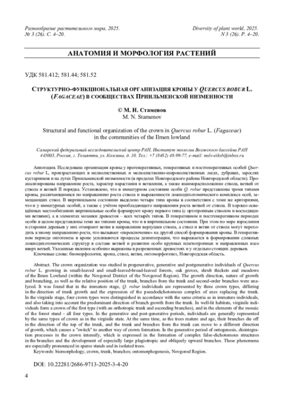 28. Стаменов М. Н. 2024 b. Архитектура кроны у взрослых деревьев Quercus robur L. (Fagaceae) в пойменной дубраве вблизи северной границы ареала (Ярославская область) // Фиторазнообразие Восточной Европы. Т. 18. № 4. С. 201-220. https://doi.org:.