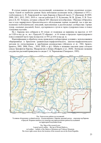 Представлены сведения о мхах гор Баркова (65°11’18“N, 60°18’8“E) и Еркусей (65°13’30.6“N, 60°21’42.6“E) на территории одного из самых крупных национальных парков России и Европы, национального парка «Югыд ва», включённого в 1995 г. в перечень Всемирного наследия природы ЮНЕСКО в составе объекта «Девственные леса Коми». В объединённой флоре мхов горных поднятий Баркова и Еркусей насчитывается 104 вида, 49 родов и 27 семейств. Для каждого вида приведена информация о его местообитаниях в горно-тундровом и гольцовом поясах. Выявлены новые места произрастания редких в регионе видов мхов, нуждающихся в постоянном контроле численности в природе (биологическом надзоре) и занесённых в Приложение 1 к Красной книге Республики Коми (Krasnaia…, 2019). Впервые для Приполярного Урала приведены три вида мхов (Dicranella subulata, Dicranum groenlandicum, Philonotis marchica).
