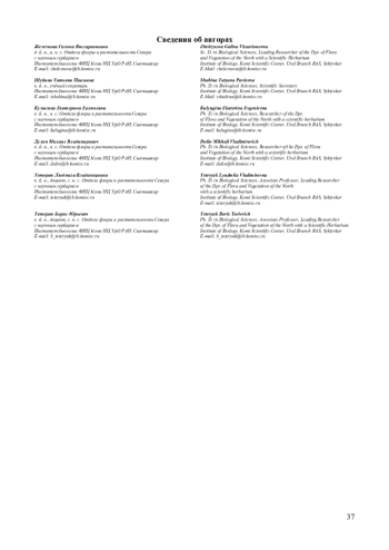 6. Дегтева С. В., Железнова Г. В. 2015. Разнообразие растительного мира северной части Саблинского хребта (национальный парк “Югыд ва”, Республика Коми) // Проблемы изучения и сохранения растительного мира Восточной Фенноскандии: тез. докл. междунар. совещания, посвящённого 100-летию со дня рождения М. Л. Раменской (15-19 июня 2015 г., г. Апатиты, Мурманская область). Апатиты. С. 25-26. EDN: UZABDK
