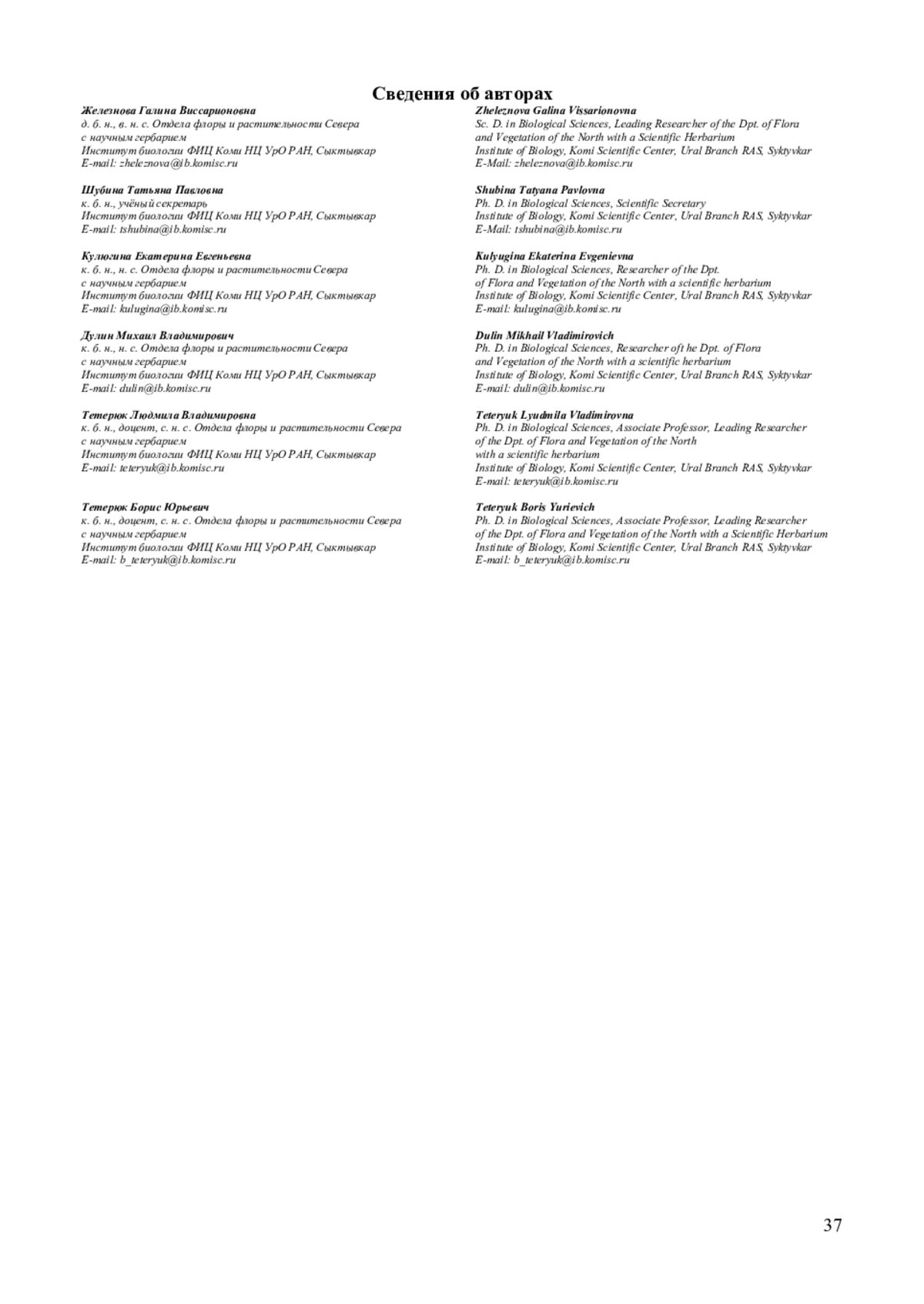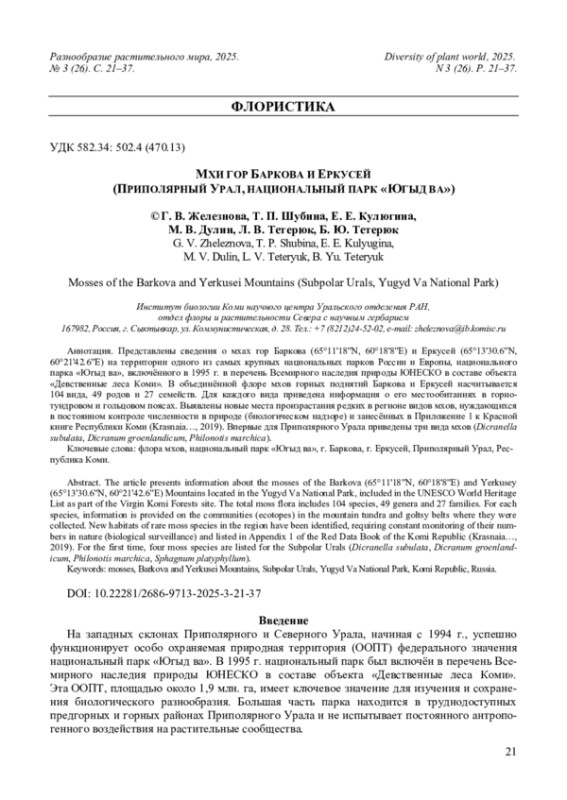 25. Zheleznova G., Shubina T., Degteva S., Chadin I., Rubtsov M. 2019. Moss occurrences in Yugyd Va National Park, Subpolar and Northern Urals, European North-East Russia // Biodiversity Data Journ. V. 7. P. e32307.